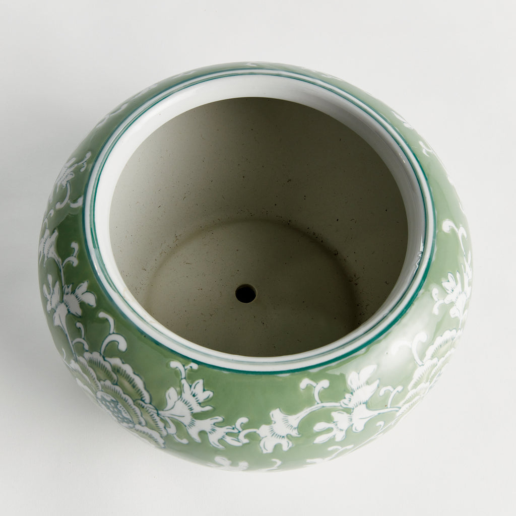 A classic chinoiserie in shades of green & white. How refreshing! The color green is known to have a harmonizing, balancing effect, and is an inspired design choice for the Imperial Lotus Planter. A welcome addition, bringing stability and calm to the well-appointed kitchen, study or covered porch.