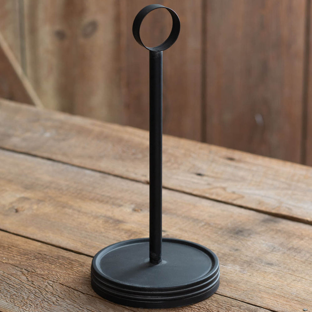 This industrial paper towel holder is black with a simplistic detachable ring on top to insert paper towels.