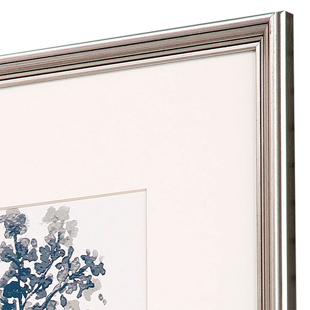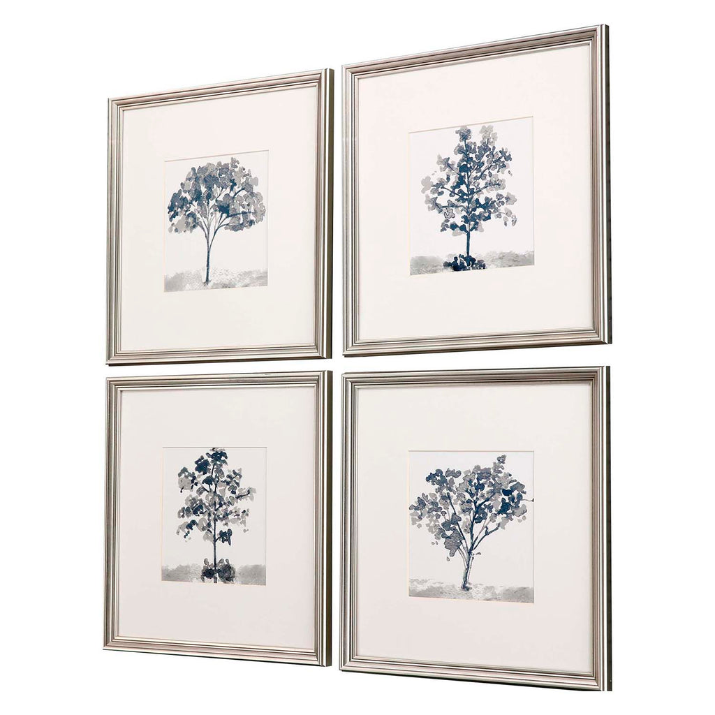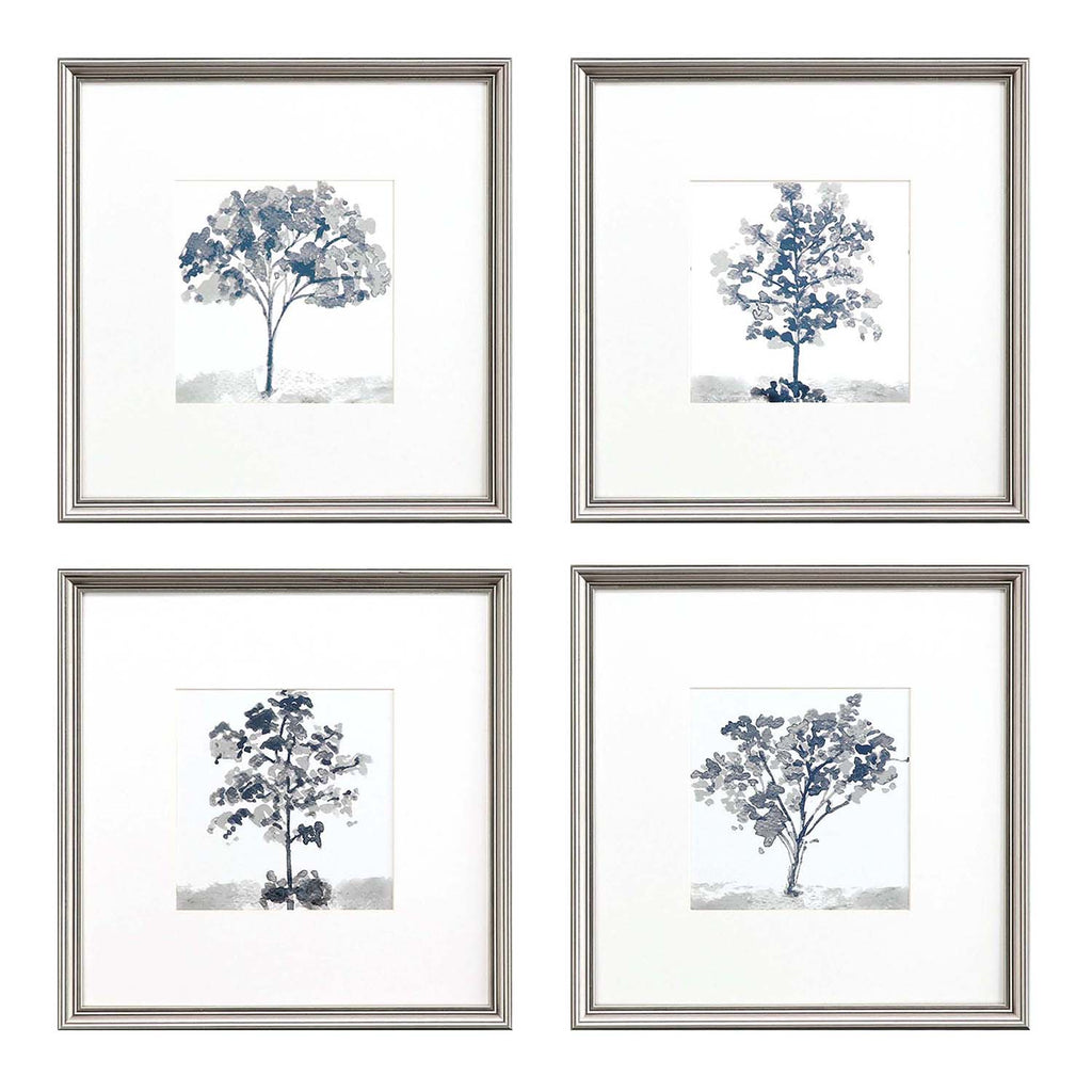 Blue trees are matted in white. Framed in a classic wood. Sold as set of four.