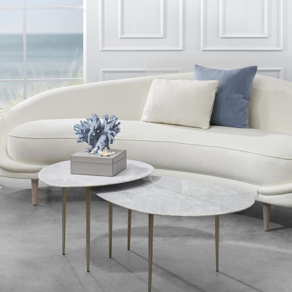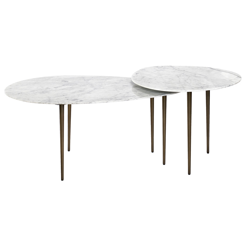 A sleek, eye-catching duo, the Alexia Bunching Cocktail Tables boast luxurious carrara white marble, stainless steel legs in an antique bronze finish and mid-century modern vibes. Granite and marble are natural materials; variations in coloration, veining and texture are to be expected. Veins, smooth to the touch, are not defects, but rather natural imperfections that add to the uniqueness and charm of each piece.