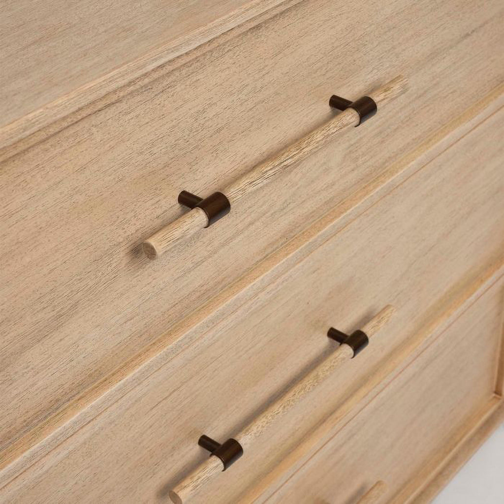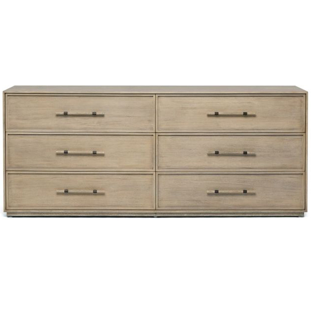 Crafted of mahogany in a washed taupe finish and featuring faux horn and brushed brass metal hardware, the Clement 6 Drawer Chest showcases integrity and artisanal vibes.