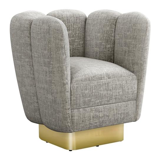 Interlude Home's worldly style brings what's now and next to the home with high fashion designed for everyday function. Offered in a range of luxe fabrics, the plush Gallery Swivel Chair makes a glamorous, Art Deco-inspired statement with polished brass or gunmetal frame.