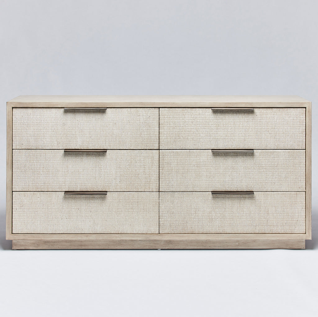 Featuring washed taupe wood with raffia insets and metal drawer pulls in satin aged bronze, the Harperly 6 Drawer Chest brings an organic calm to a storage must-have. This item is made of solid wood. Item will not be exactly as pictured, subtle deviations in hue after finishing can be expected as a result of natural variations in coloration of the base material.