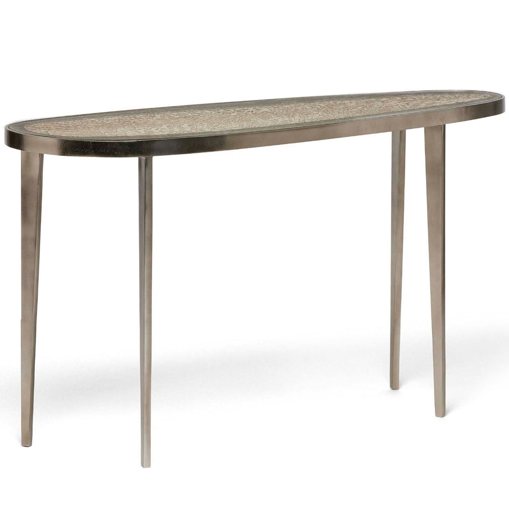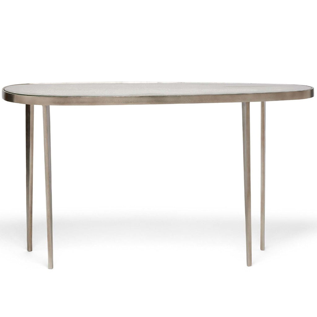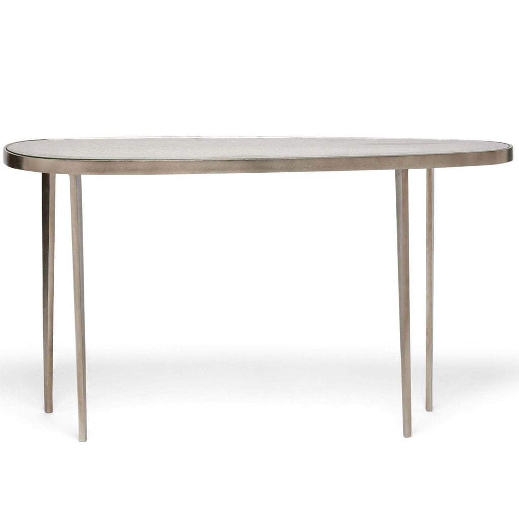 Taupe Gray reactive glass and an aluminum base in a champagne finish add dramatic flair to the eye-catching Jan Console Table.