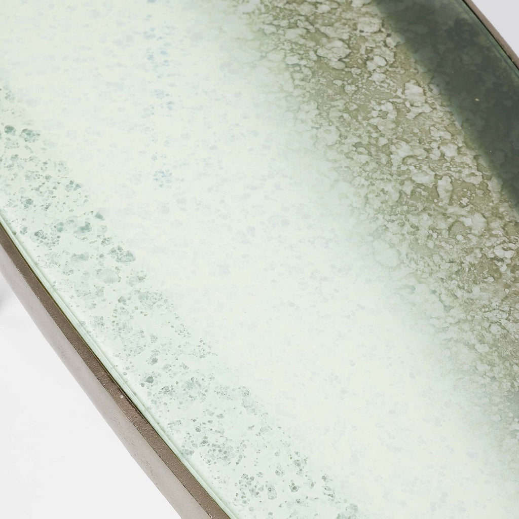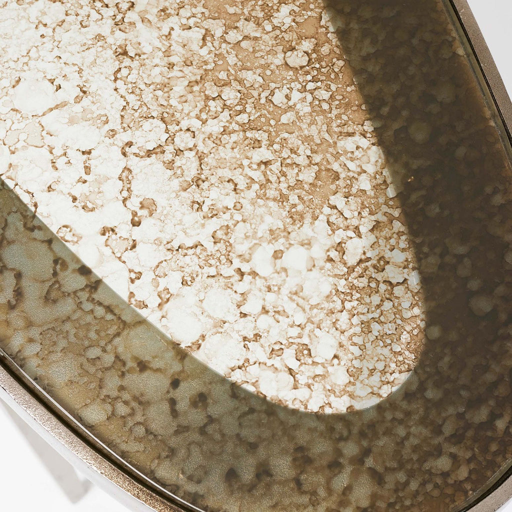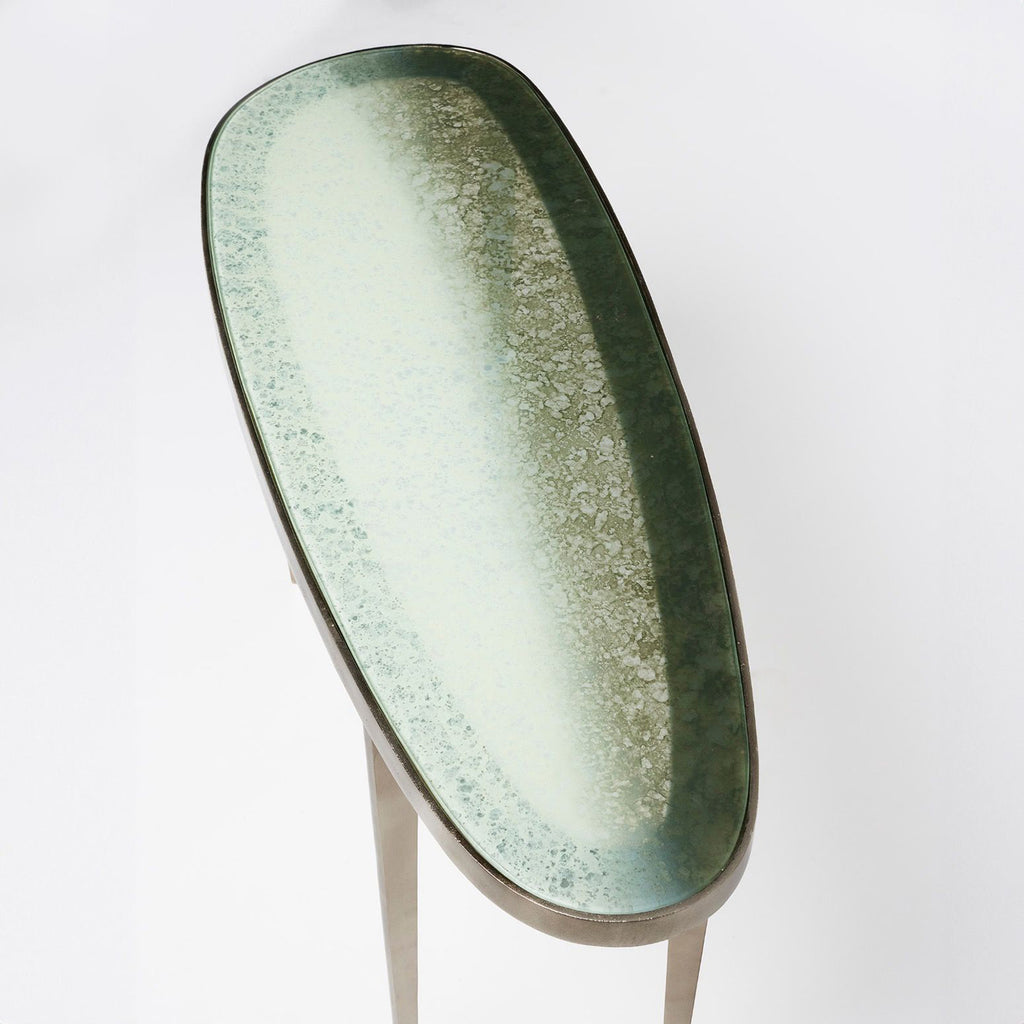 Taupe Gray reactive glass and an aluminum base in a champagne finish add dramatic flair to the eye-catching Jan Console Table.
