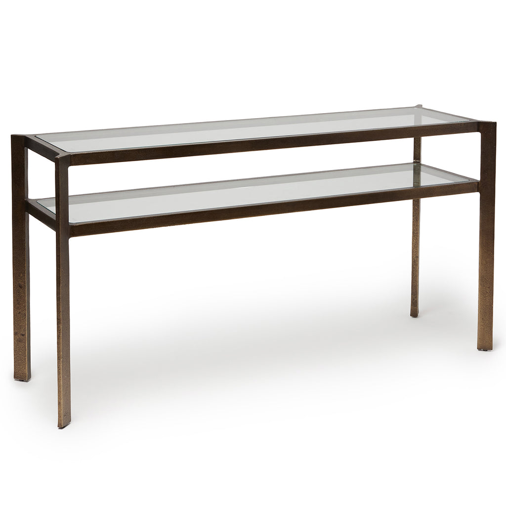 Thanks to its grand proportion and sculptural deep bronze frame, the metal and glass Linley Console makes a dramatic statement.