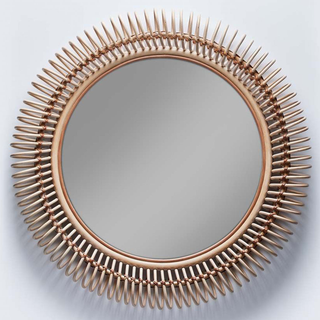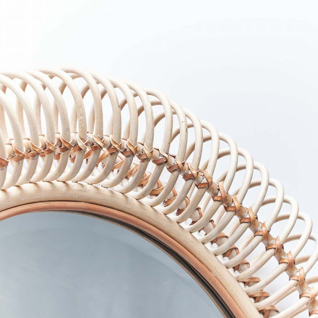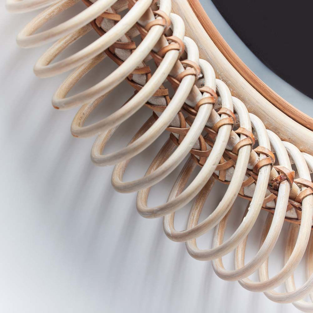 Rings of white washed rattan complement the boldly sized Miramar Round Mirror to add true dimension and organic texture.