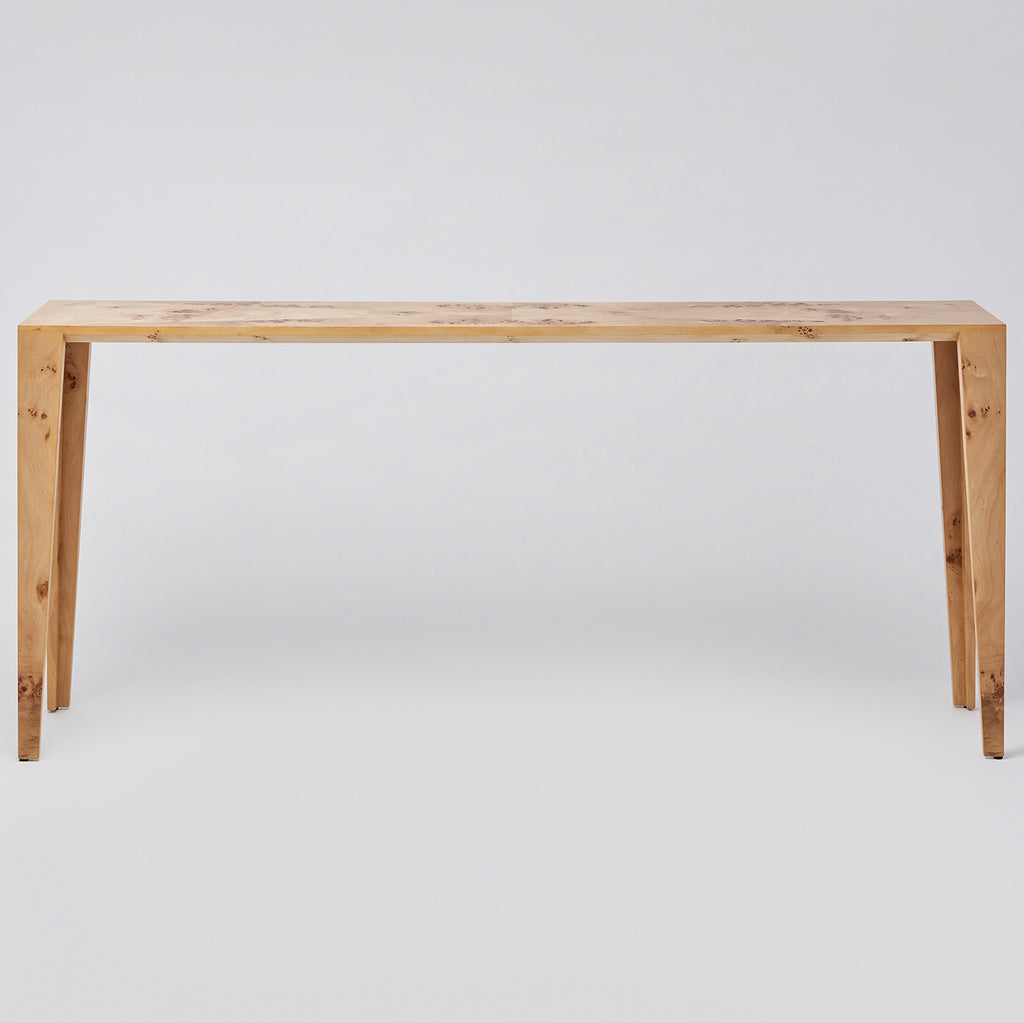 A simple Scandinavian silhouette showcases the stunning depth and intrigue of ash burl in the form of the Sherwood Console in a canyon finish. This item is made of solid wood. Item will not be exactly as pictured, subtle deviations in hue after finishing can be expected as a result of natural variations in coloration of the base material.
