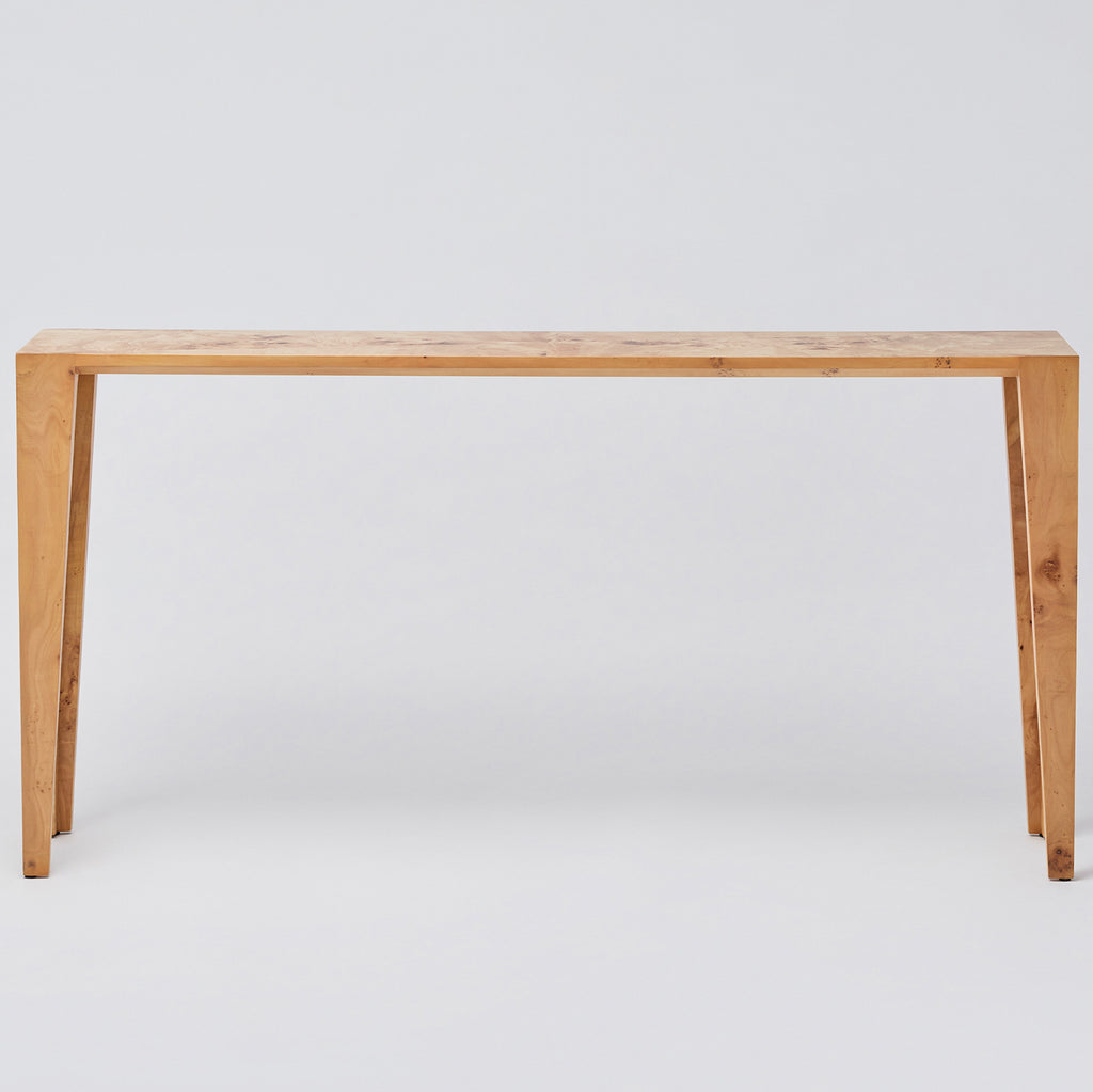 A simple Scandinavian silhouette showcases the stunning depth and intrigue of ash burl in the form of the Sherwood Sofa Table in a canyon finish. This item is made of solid wood. Item will not be exactly as pictured, subtle deviations in hue after finishing can be expected as a result of natural variations in coloration of the base material.