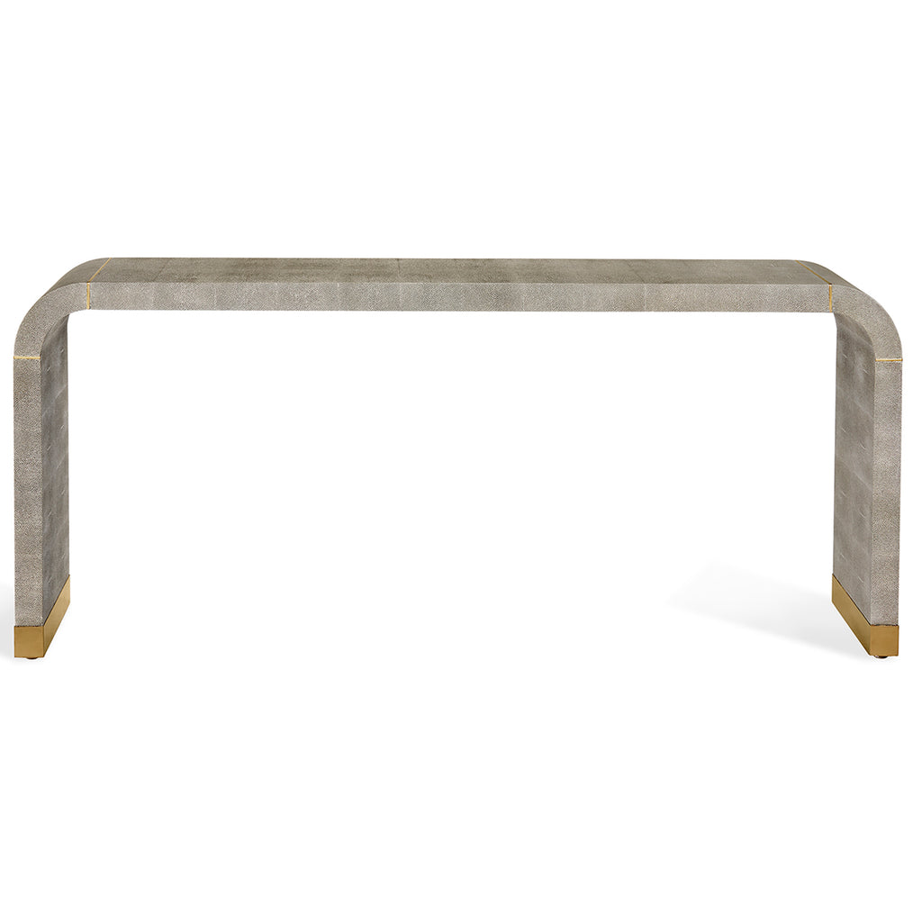 Undeniably high style, the Sutherland Console Table features the luxe texture of sorrel olive faux shagreen highlighted by brushed brass trim.