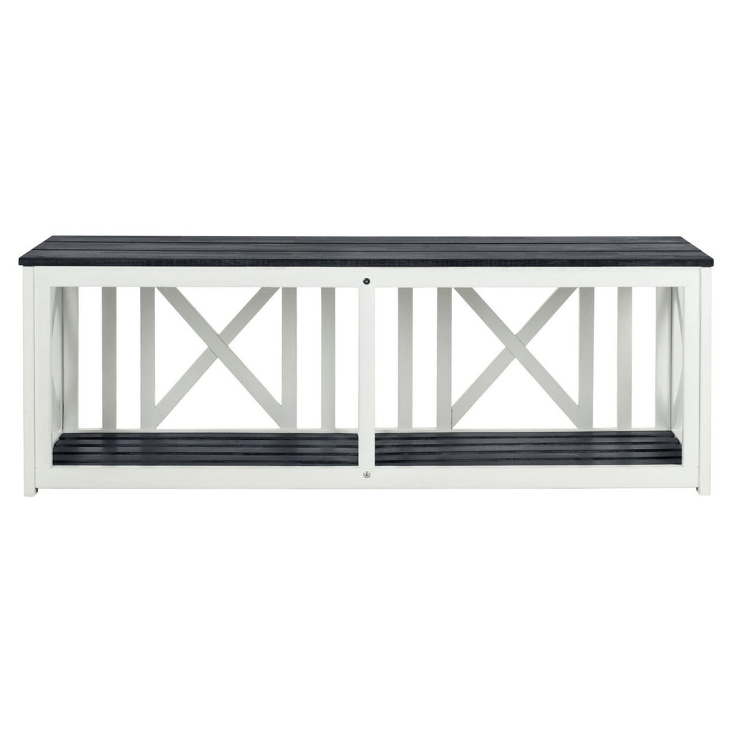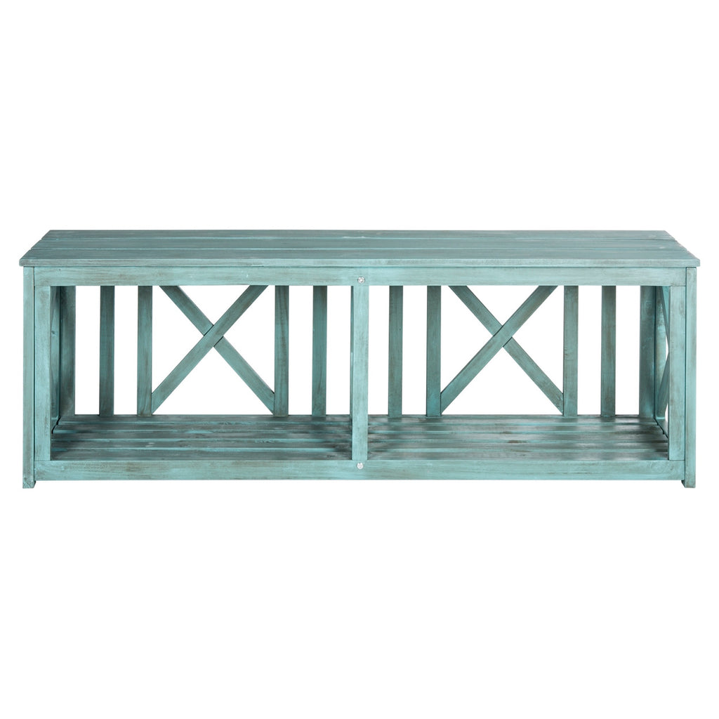 The classic elegance of the Branco Bench belies its capacity to store outdoor pillows, warm throws for chilly evenings and all of the accoutrements that bring ease to outdoor living. Crafted of beach house blue acacia wood and galvanized steel for ease of care.
