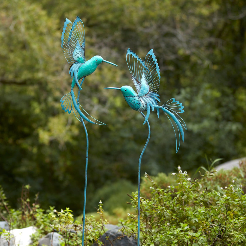 Enhance your garden and lawn decor with this whimsical set of Metal Hummingbird Yard Stakes. Featuring two assorted designs, this set is sure to bring an elegant touch of nature to your outdoor decor. The cool blue and green tones paired with the cut-out hummingbird design and quality iron metal is the perfect combination to create a stunning display. Display this set in your in porch planters or arrange them among your garden flowers to share the beauty with all who visit!