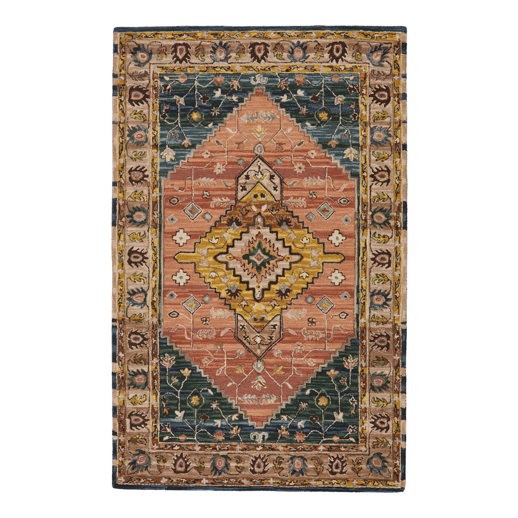 The hand-tufted Jaipur Cardamom collection boasts vivid jewel tones and uniquely distressed Turkish motifs, crafted to emulate traditional sun-faded, vintage designs. The Seraphina rug showcases a vibrant medallion motif in a rich color palette of dusty pink, yellow, brown, and deep blue-green. Inspired by the artistic imperfection of dye-lot changes in perfectly aged wool textiles, the looped pile of this rug features tonal colorway depth and textural dimension.