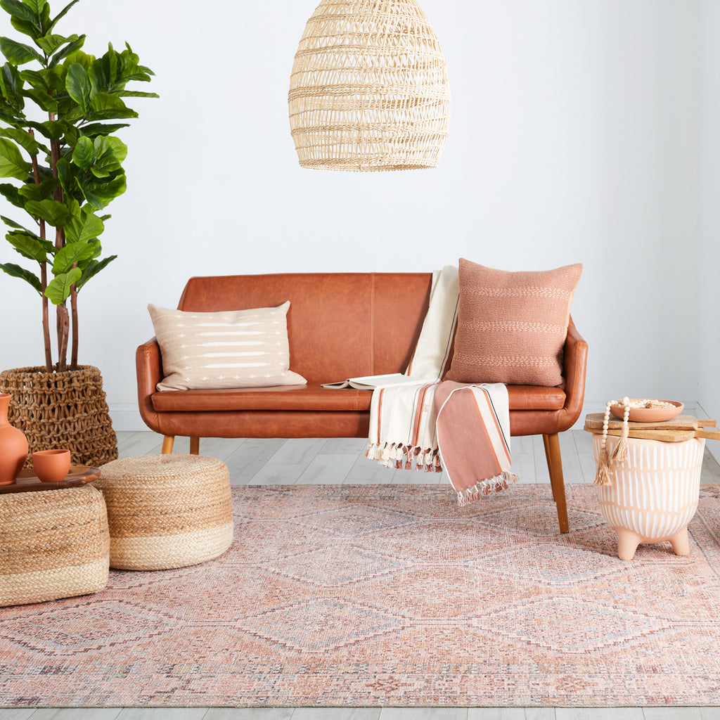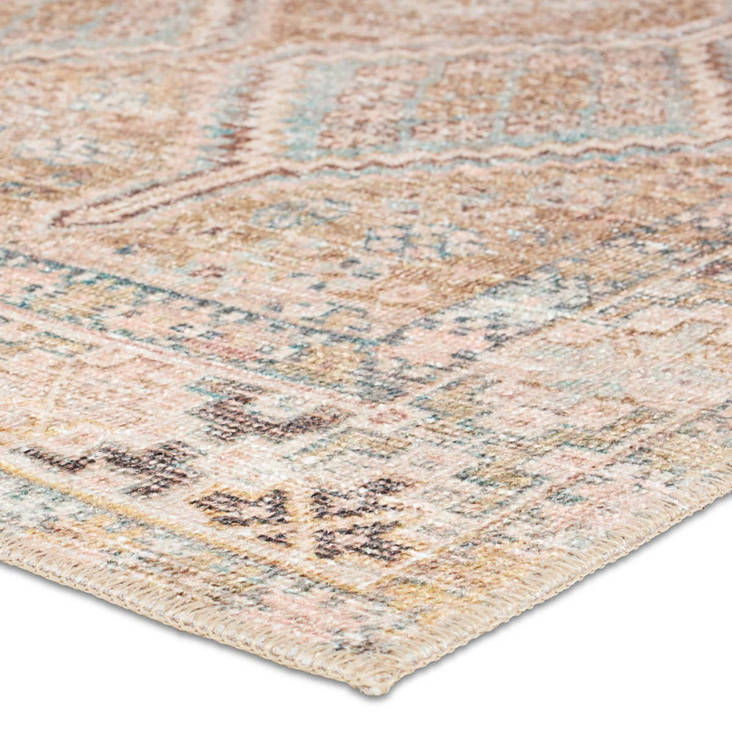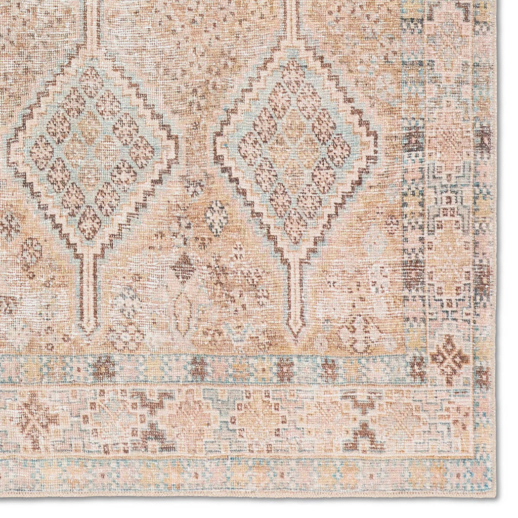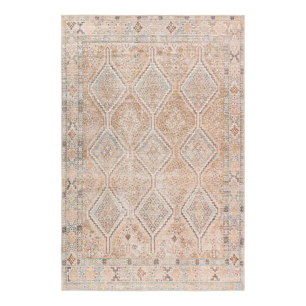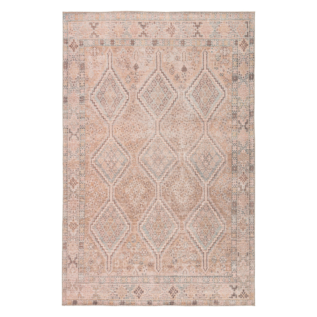 The Jaipur Kindred collection melds the timelessness of vintage designs with modern, livable style. The Marquesa area rug boasts an elegantly distressed Turkish diamond pattern in contemporary tones of light pink, blue, gold, and brown. This low-pile rug is made of soft polyester and features a one-of-a-kind antique rug digitally printed design.