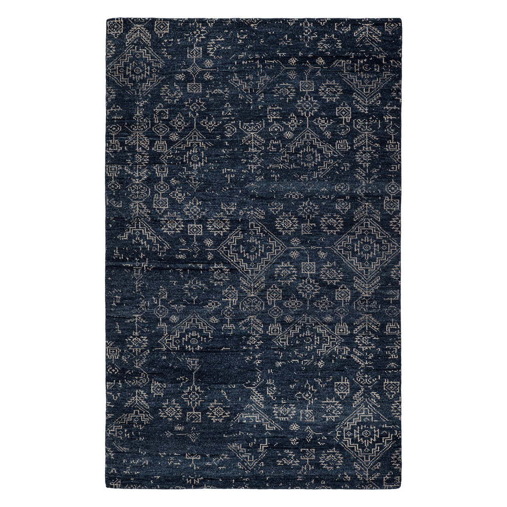 The Jaipur Liberty collection infuses homes with traditional design and exceptional artisan-made accents. The hand-knotted Azuma rug showcases an all-over tribal motif with broken, distressed details. Deep blue and black tones ground this durable wool rug, while the light gray pattern pops for a transitional look.