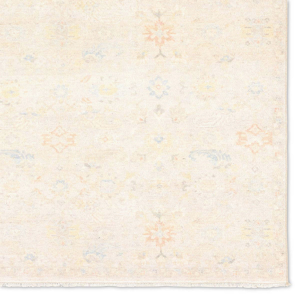 The Jaipur Living Boheme collection brings vintage inspiration to life with ornate, worldly designs and a timeless distress effect. The Aaina area rug features an updated traditional, pastel Oushak pattern in faded yet comforting hues of cream, and light blue, with hints of orange, yellow, and green. Soft florals, a faded trellis design, thin border, tasteful distressing, and short, cream fringe create an elegant, vintage feel. In Turkey, this design is printed onto a 1/6th inch thick cotton, polyester, and soft chenille base with a flat finish and low-profile feel. Printed rugs are durable, easy to clean, and comfortable underfoot perfect for high traffic areas of the home like playrooms, halls, living rooms, and entryways.