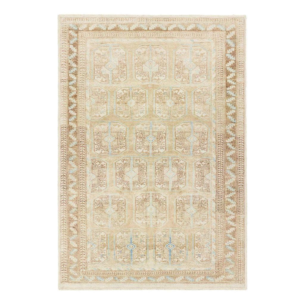 The Jaipur Living Casen Magnus design features a traditional pattern of small medallions set against a warm tan and beige backdrop, highlighted by subtle blue accents. Its vintage, distressed finish adds character and charm, making it feel like a treasured heirloom from the very first step.