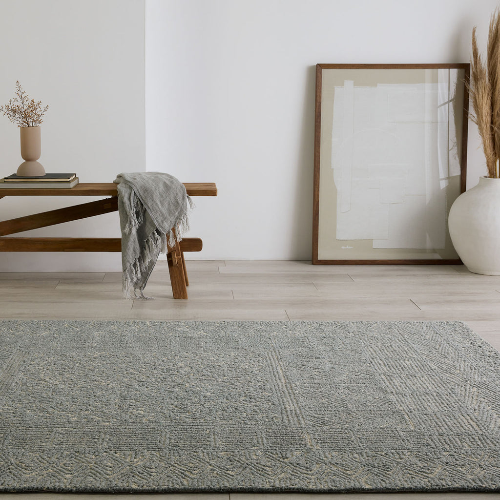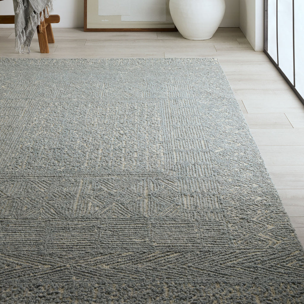 The stunning hand-tufted Jaipur Living Lineage collection boasts intricate detailing and beautiful texture. A modern take on African and Moroccan motifs, these wool rugs lend pattern and interest with the versatility of neutral tones. The intricate Viatte design features an eclectic mesh of stripes and geometric shapes that creates a stunning accent piece. Made of blue and cream looped pile with varying height, this texture-rich area rug thrives in medium and low traffic areas of the home like bedrooms, formal living areas, and dining rooms.