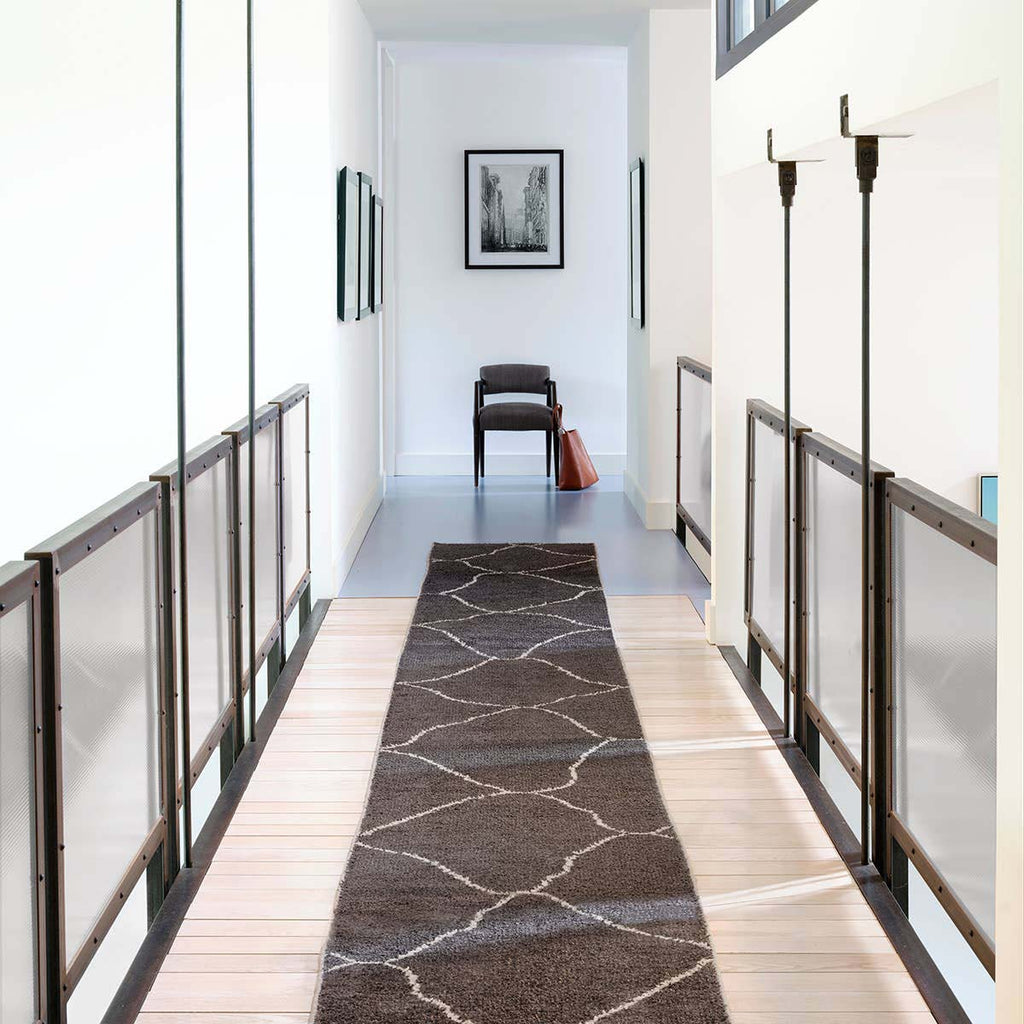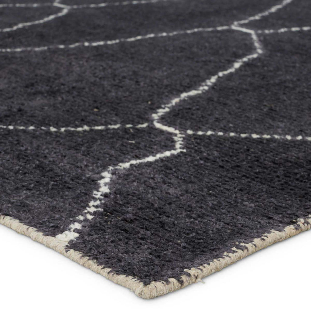 This modern hand-loomed rug enriches spaces with bold geometric patterning and a temptingly soft feel. Texture-rich and captivating in sleek spaces, this accent showcases an asymmetrical Moroccan lattice design in a deep blue and white colorway.