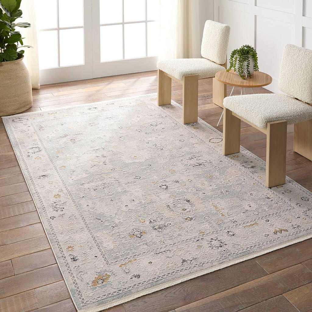 From ethereal abstract motifs to elegant scrolling florals, the Jaipur Living Thalia collection boasts a soft, tonal touch that complements an array of interior styles. The traditional Oushak designs and thick border of the Ariene area rug pair effortlessly with the cool gray, cream, tan, and subtle blue colorway. Both water and stain-resistant, the high-low polyester and polypropylene fibers are easy to clean while maintaining a plush feel underfoot. This power loomed piece can endure high traffic areas, children, and pets, creating a perfect accent for any modern home.
