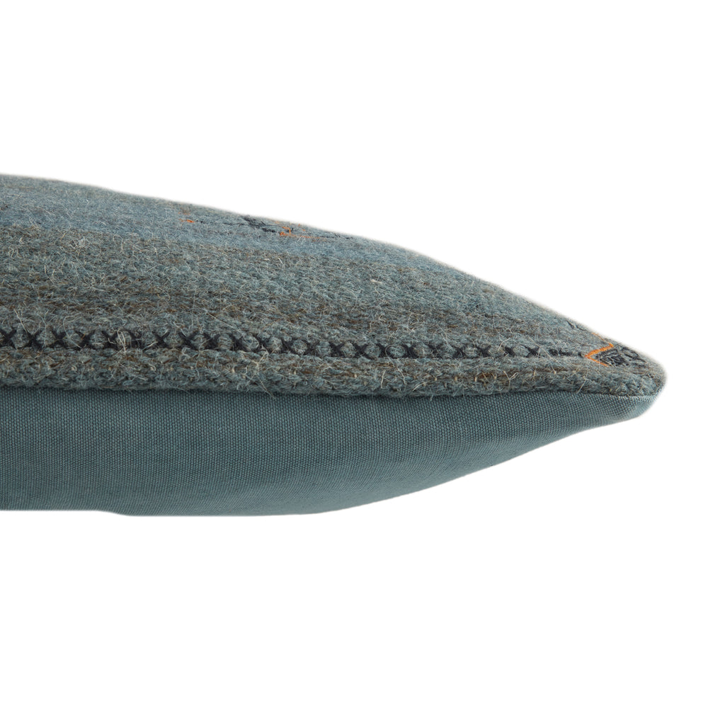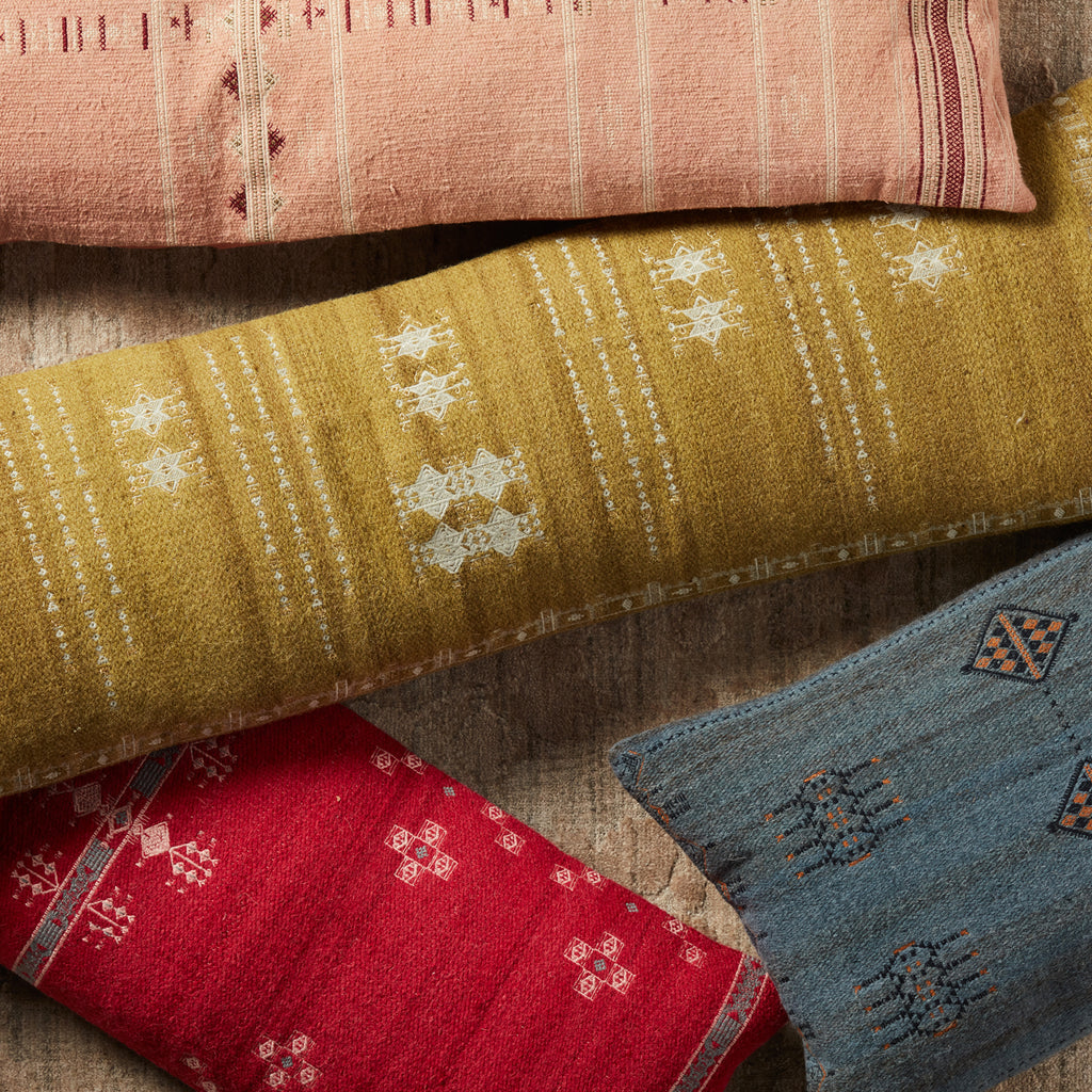 Inspired by Moroccan Sabra styles, the Jaipur Puebla collection boasts vibrant color palettes and intricate tribal embroidery. The Tanant lumbar pillow features a deep, inviting blue colorway with warm gold details and a textural, India-sourced wool weave.