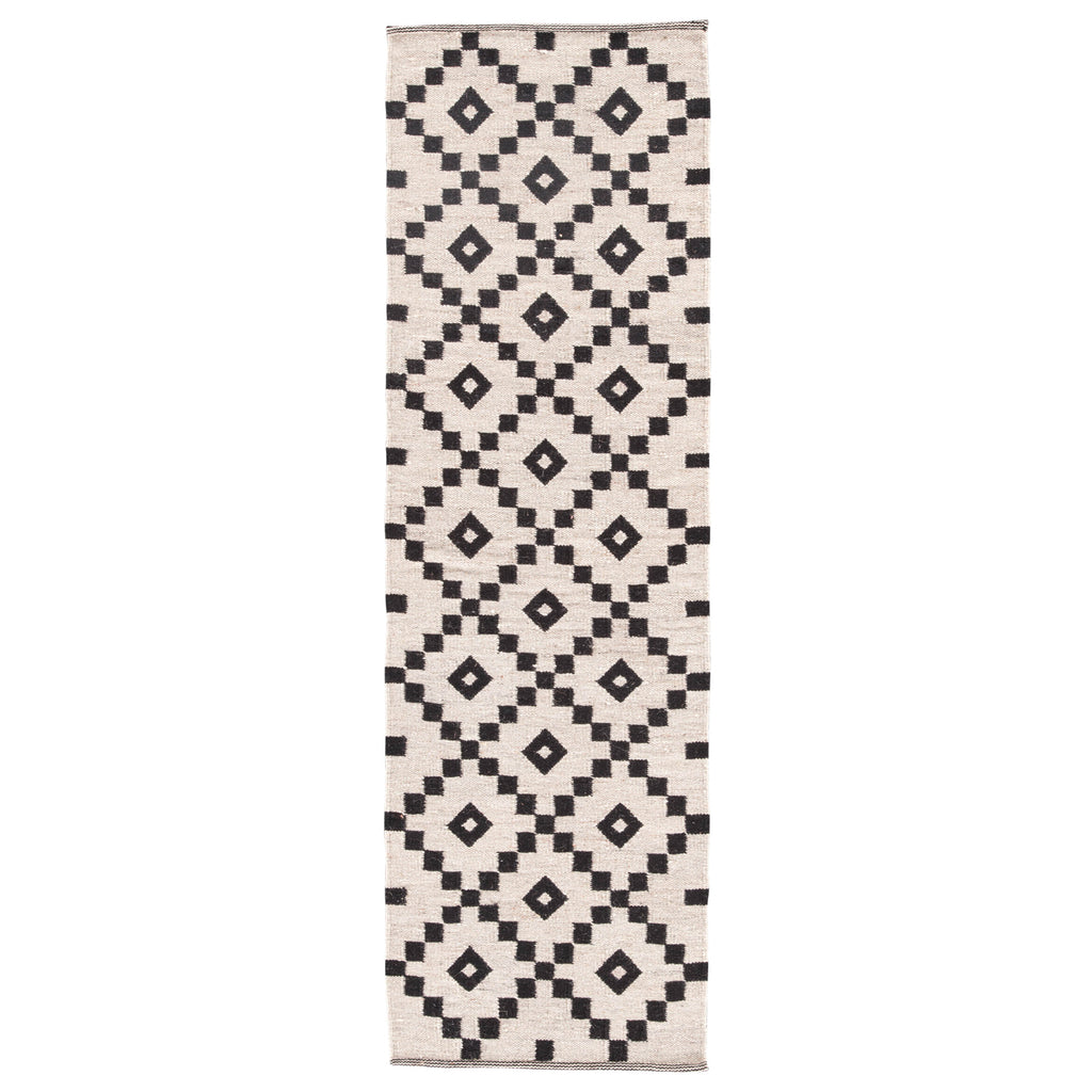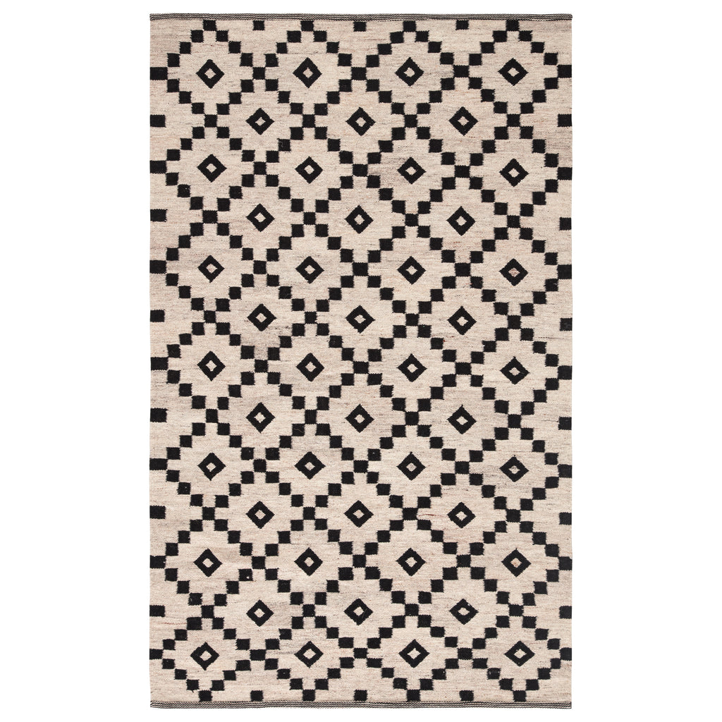A modern twist on traditional flatweave style, this sleek layer showcases a black trellis design on a natural undyed wool backdrop. The geometric shapes lend a fresh update to this eye-catching accent.