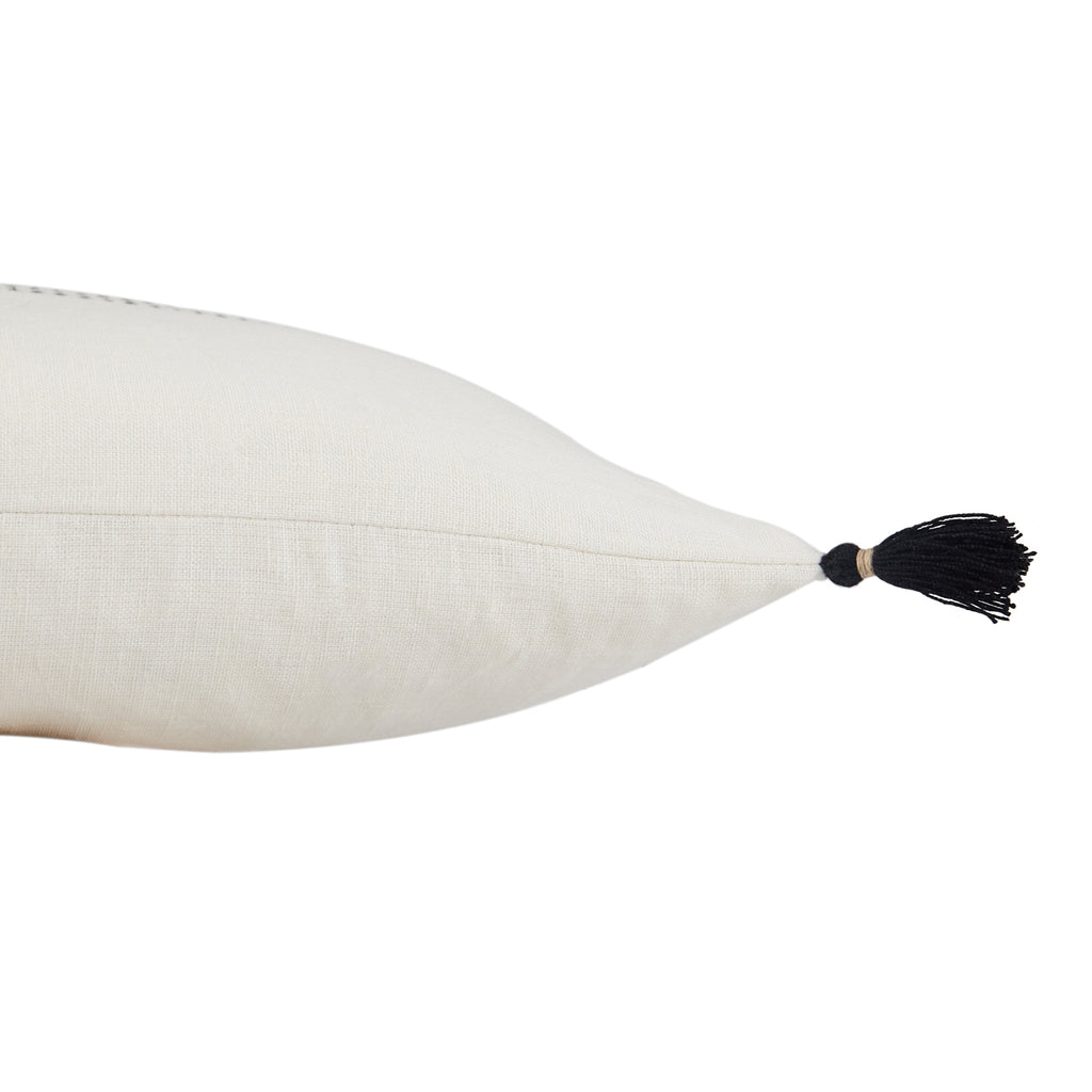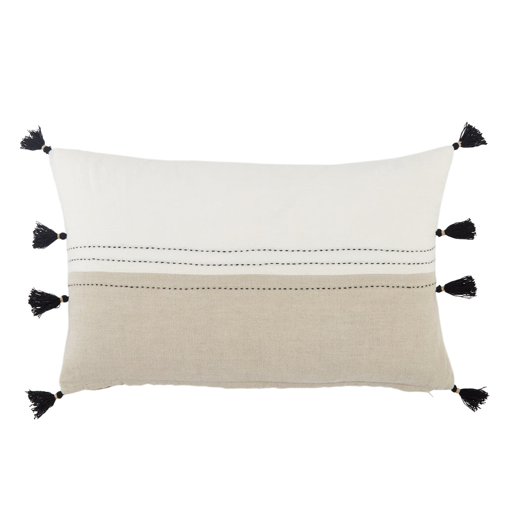 Sophisticated simplicity defines the texturally inspiring Jaipur Taiga collection. Crafted of soft linen, the Yamanik pillow boasts a neutral color-blocked design accented by black, stitched stripes and petite tassel details.