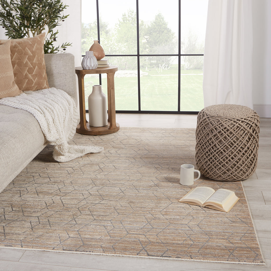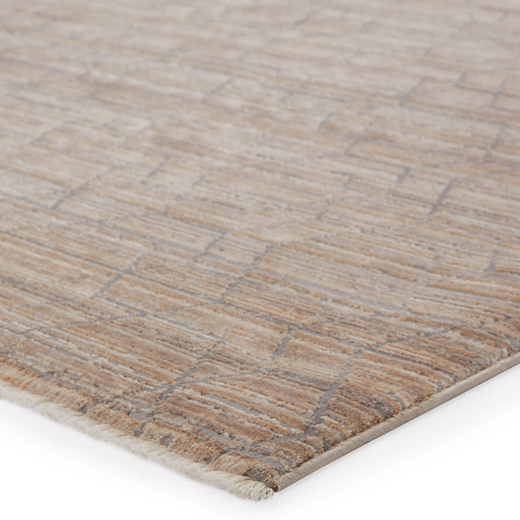 The Jaipur Vienne collection showcases the on-trend blanc de blanc look for an effortless and luxuriously vintage statement. The Cavendish rug boasts a distressed geometric lattice in warm tones of tan, gray, and taupe with accents of metallic gold and bronze. Soft and lustrous, this chameleon-like design emulates the timeless style of a Turkish hand-knotted rug, but in an accessible polyester and viscose power-loomed quality.