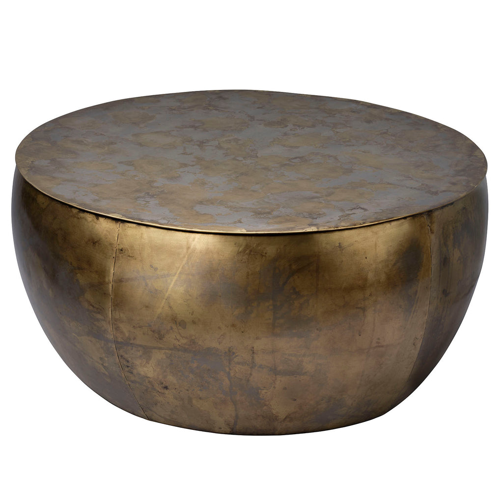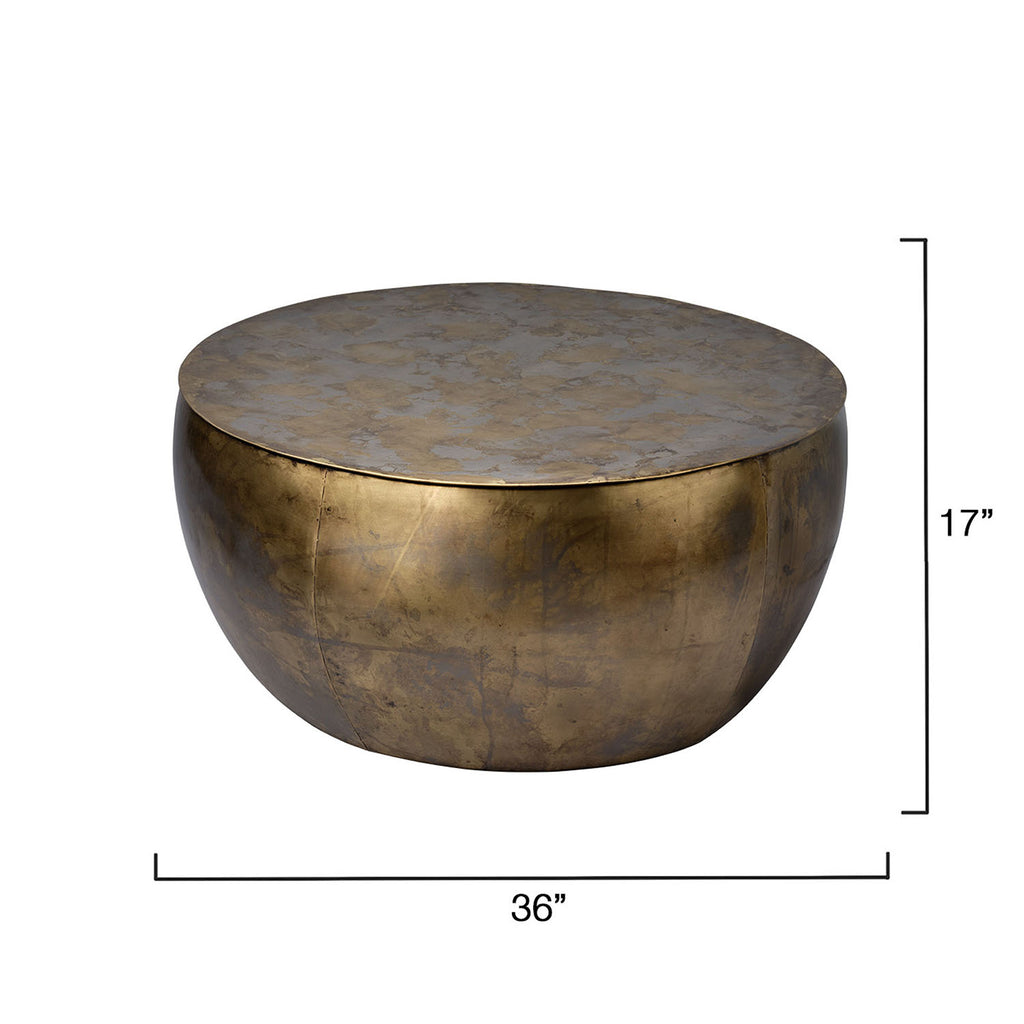 A luminous mix of antique brass and silver tones gives this handcrafted coffee table its distinctive warmth and modern allure. The wide drum silhouette adds sculptural balance and visual weight to living spaces, while its smooth surface invites effortless styling. Perfect paired with plush seating or natural textures, it creates a refined focal point that embodies both contemporary sophistication and timeless craftsmanship.