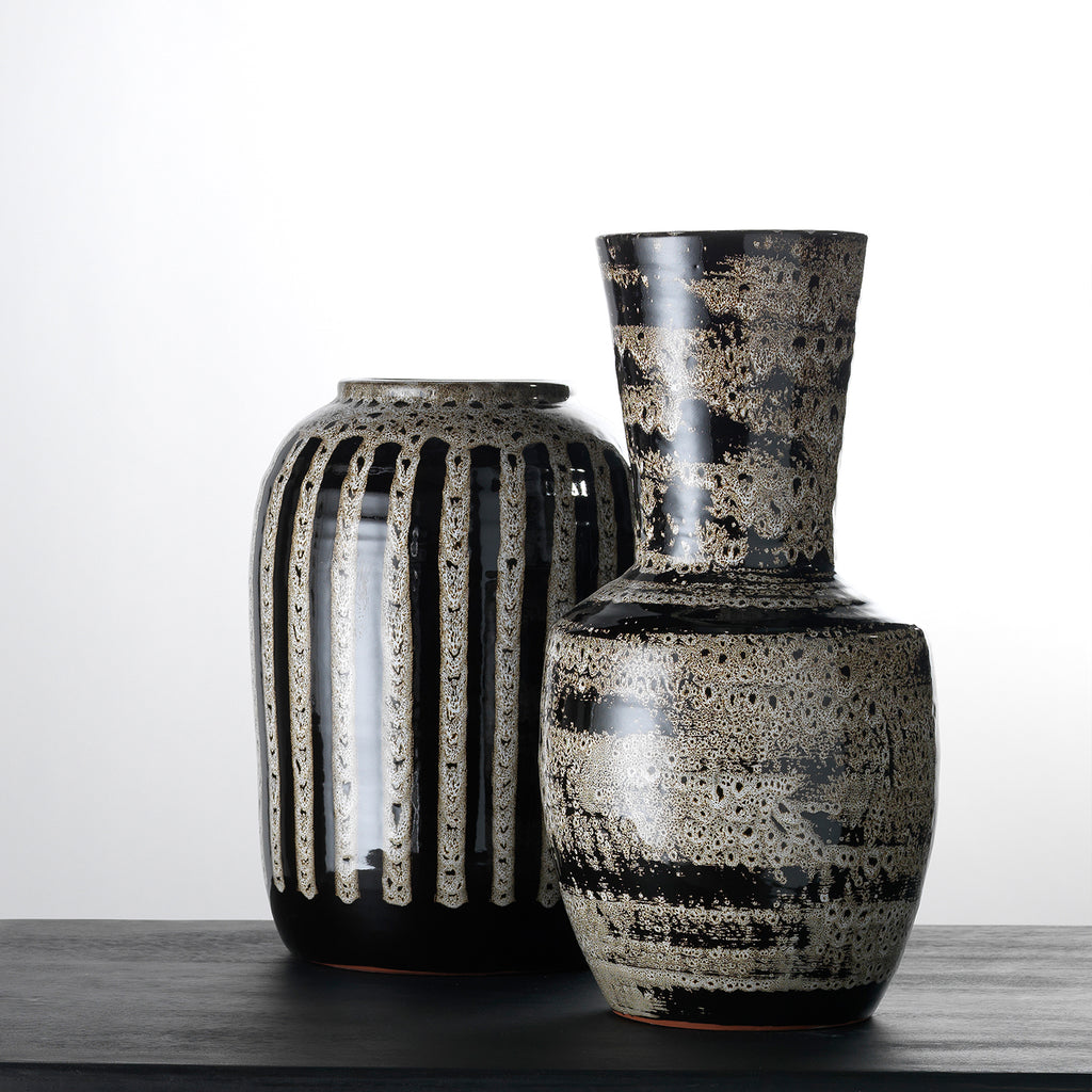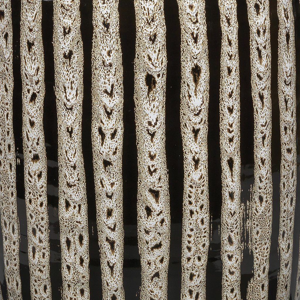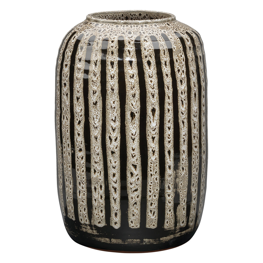 Neutral stripes of beige and black adorn the large scale of the Jamie Young Barnaby vase creating a beautiful mix of striking statement in neutral finishes.