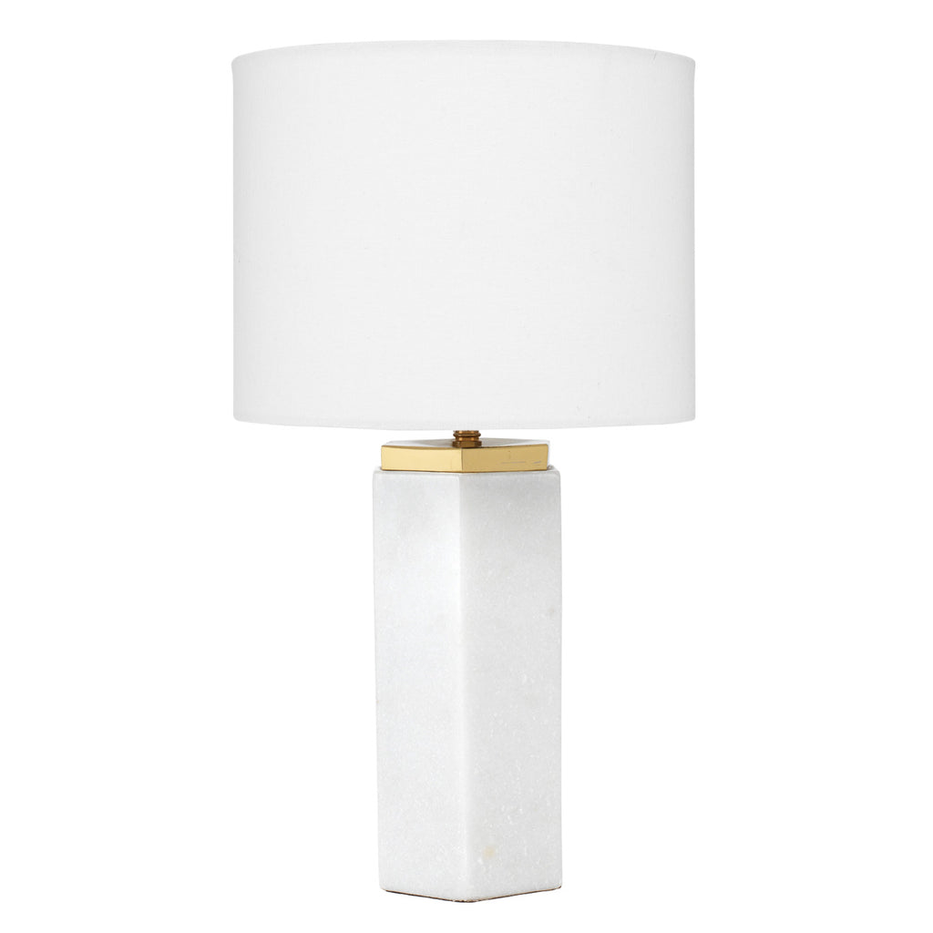 Introduce a timeless touch to your interiors with this accent table lamp. The simple geometric form is hand-carved of white marble that's richly veined for subtle dimension and capped with antique brass. Topped with a linen drum shade offering tonal beauty that suits classic and contemporary settings alike.