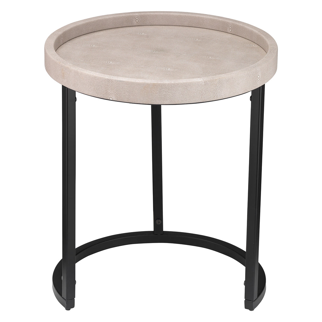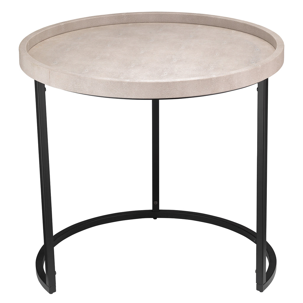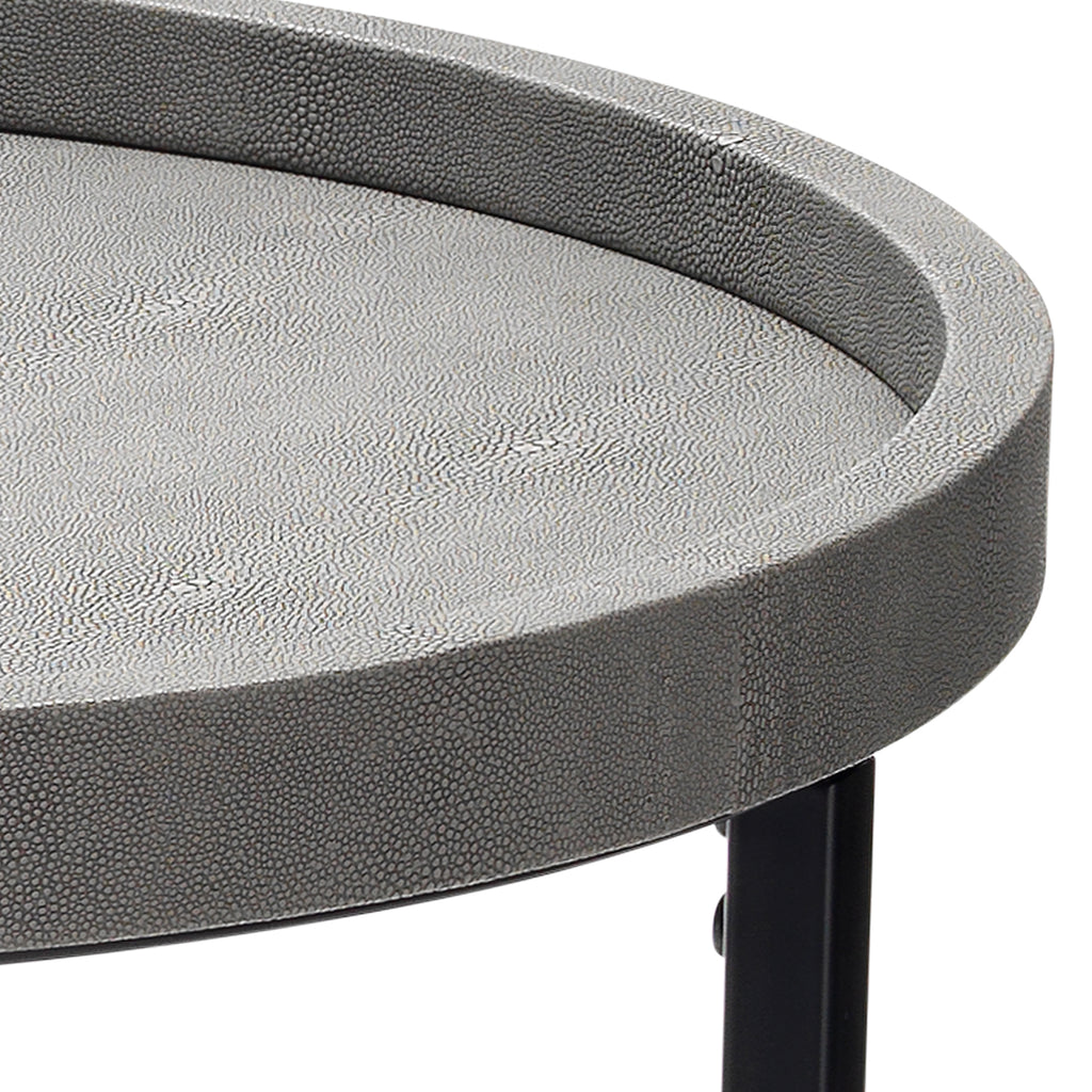 Shagreen is traditionally made from the richly textured skin of stingrays. It was popularized in Japan where it was used to wrap the handles of samurai swords, and in the centuries since it has adorned only the most luxurious home accents. Our cruelty free version of this material elevates the easy lines of the Maddox side tables. We include three nesting tables in the set. The half-moon bases are in black metal and a choice of cream or gray is offered for the tabletops.