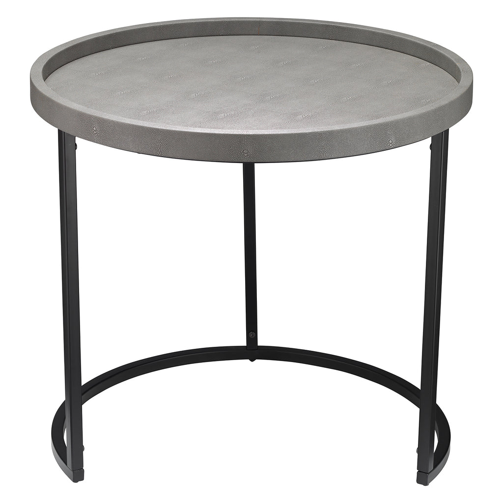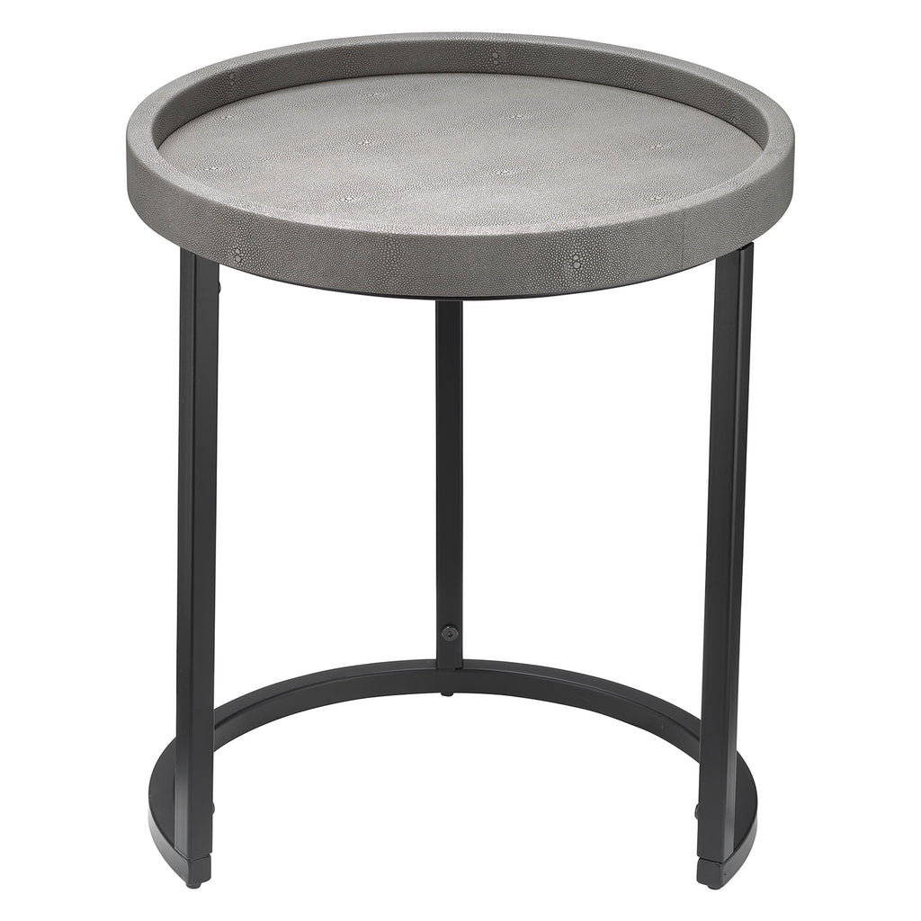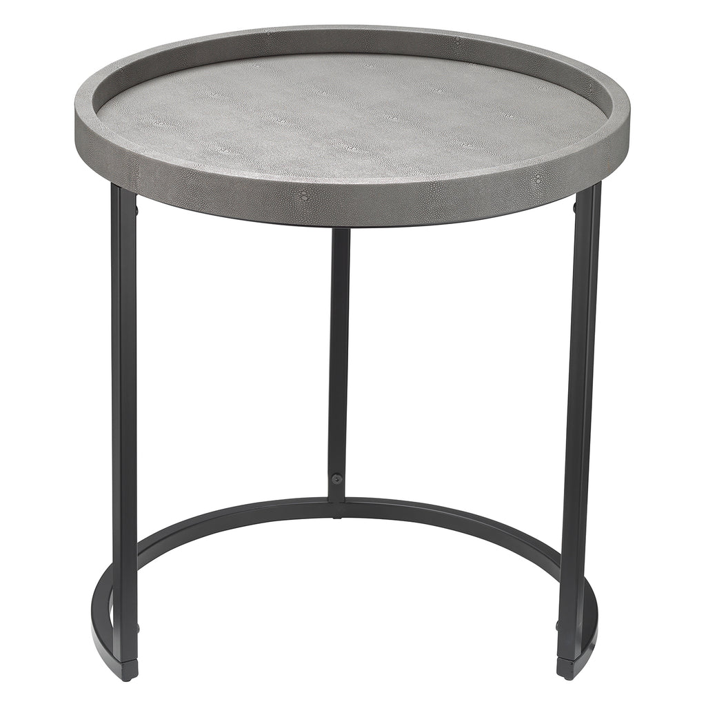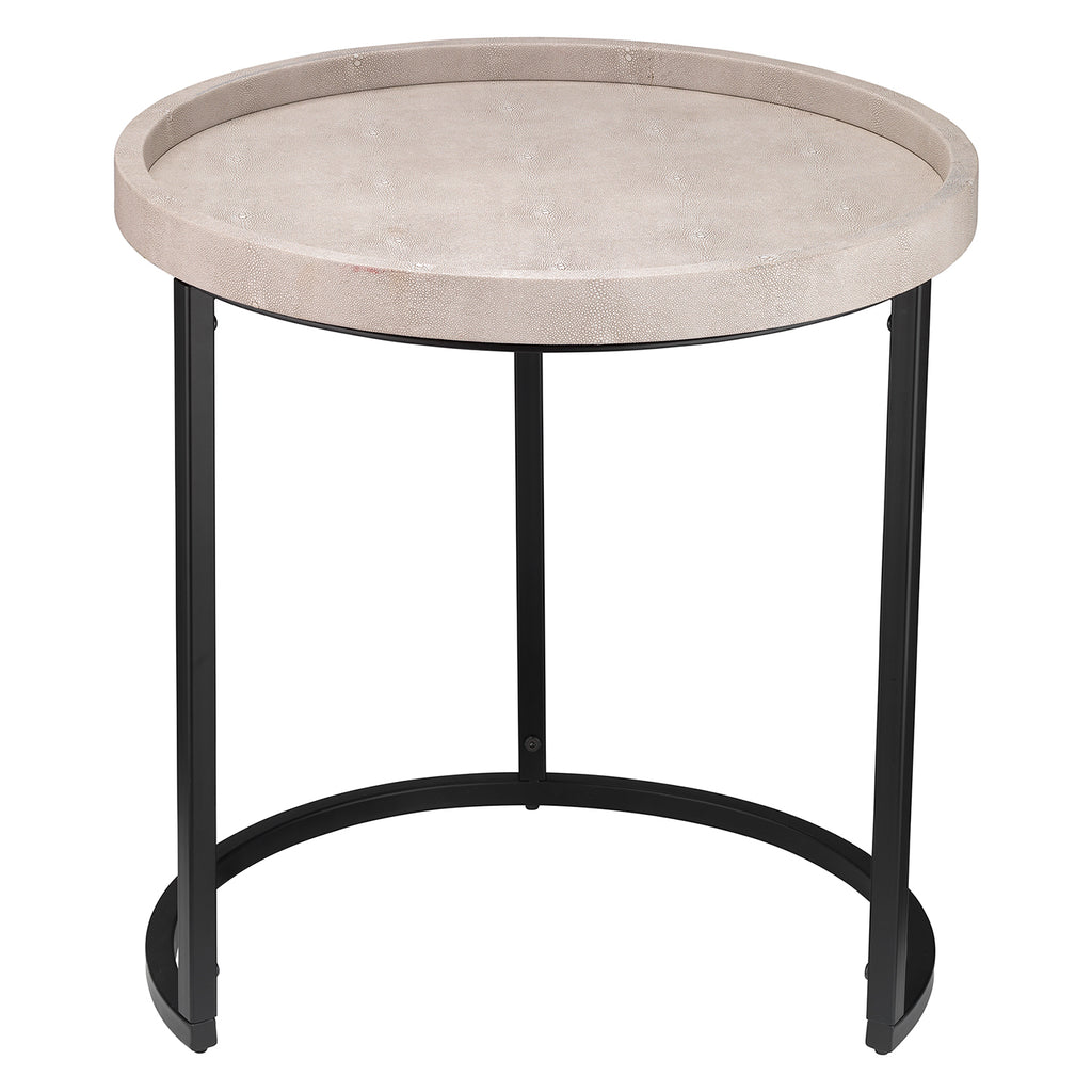 Shagreen is traditionally made from the richly textured skin of stingrays. It was popularized in Japan where it was used to wrap the handles of samurai swords, and in the centuries since it has adorned only the most luxurious home accents. Our cruelty free version of this material elevates the easy lines of the Maddox side tables. We include three nesting tables in the set. The half-moon bases are in black metal and a choice of cream or gray is offered for the tabletops.