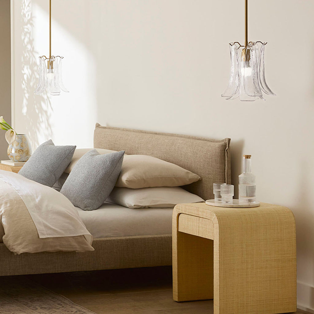 The shades of these artisan-crafted pendants were inspired by the fields of calla lilies that bloom wild in Big Sur. Featuring gracefully curved leaves in glass rimmed with a touch of metal, they hang from an adjustable antique brass rod and canopy. Traditionally hung above a table or kitchen island, they offer endless display options if you have vaulted ceilings!