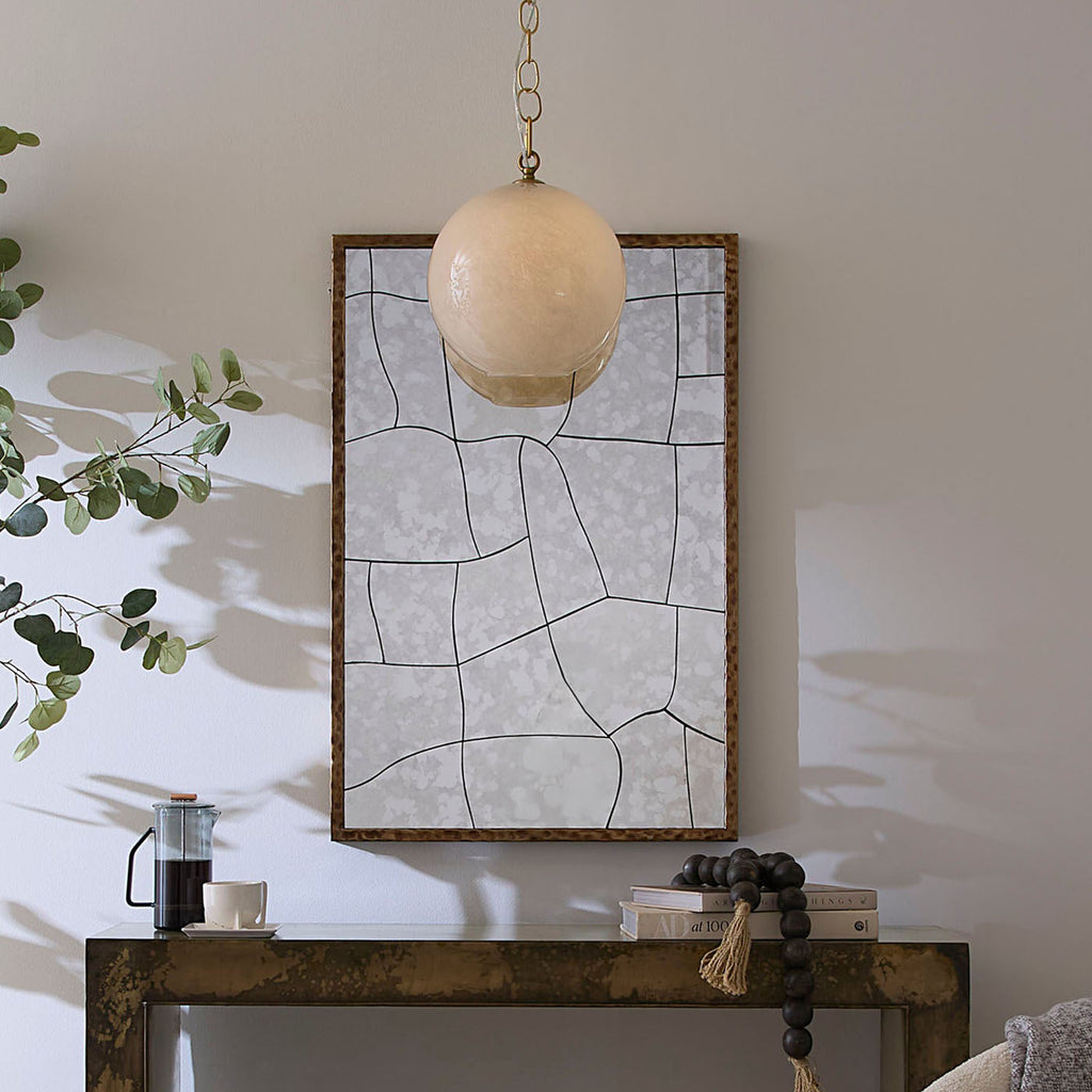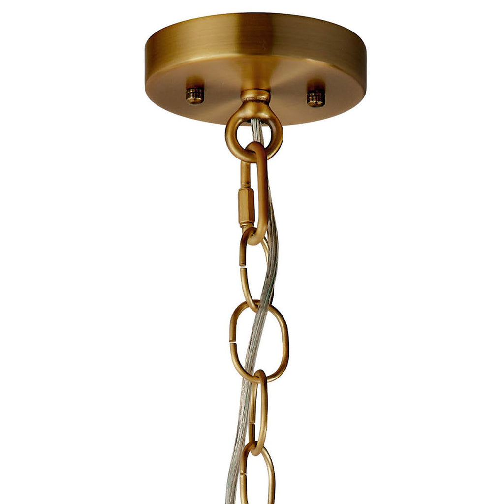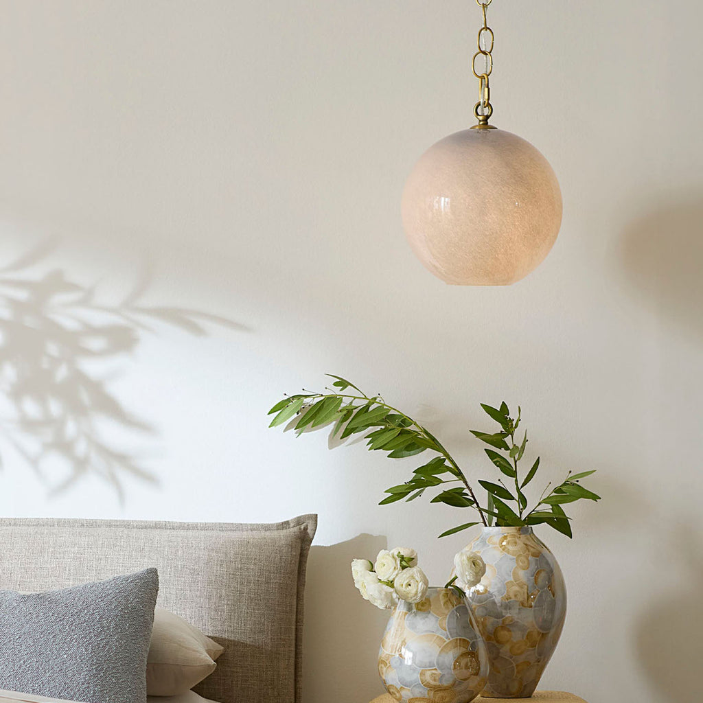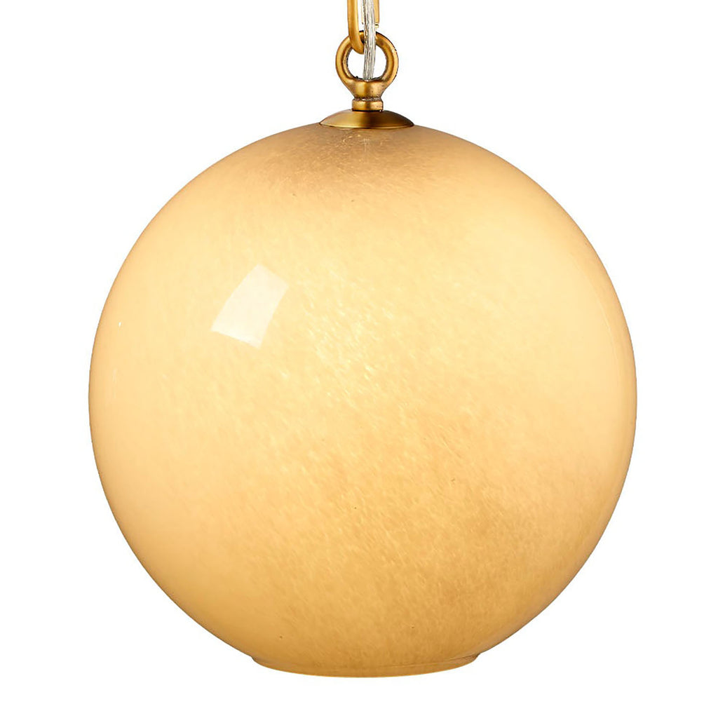 An expertly hand-blown sphere of glass hangs suspended from burnished antique brass links and a coordinating brass canopy in this simply striking pendant lamp. It shines beautifully on its own, illuminating a cozy corner of a den or entryway, or it can create a magnificent display when grouped over a kitchen island or dining table.