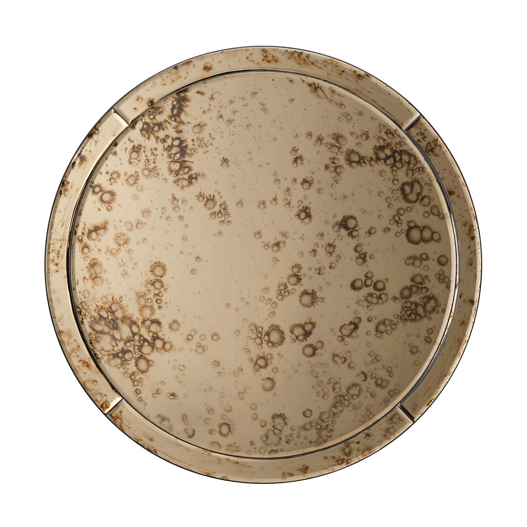 Encircled in mirrored panels and centered with antique glass, this round mirror is finished in a warm brown patina. Its gently aged finish remains functional, while the faceted frame adds quiet dimension and elegance. Ideal above a console or vanity, it enhances interiors with light and depth. A perfect fusion of modern clarity and vintage romance, this mirror embodies timeless sophistication and refined craftsmanship.