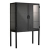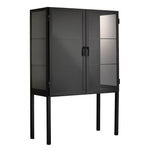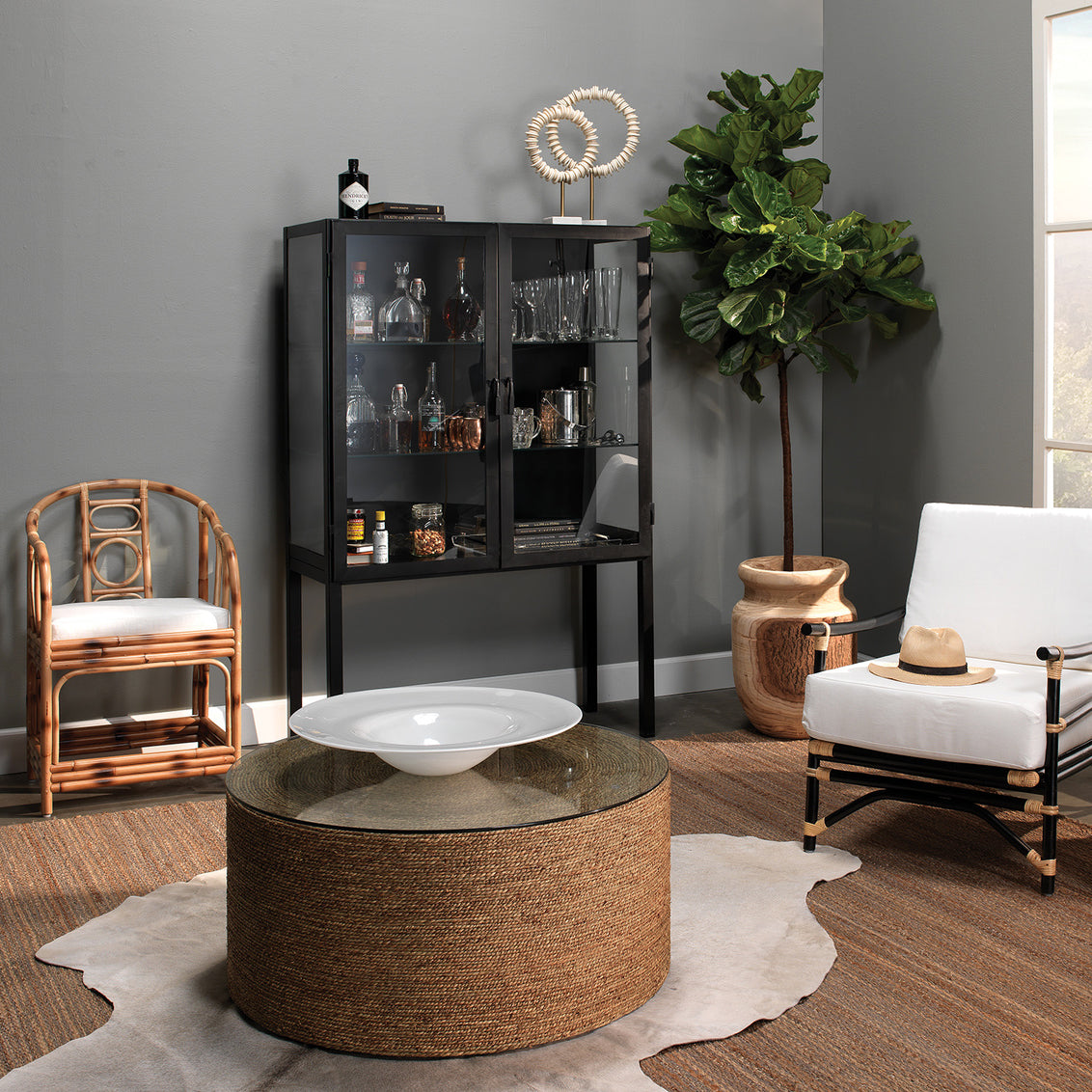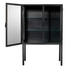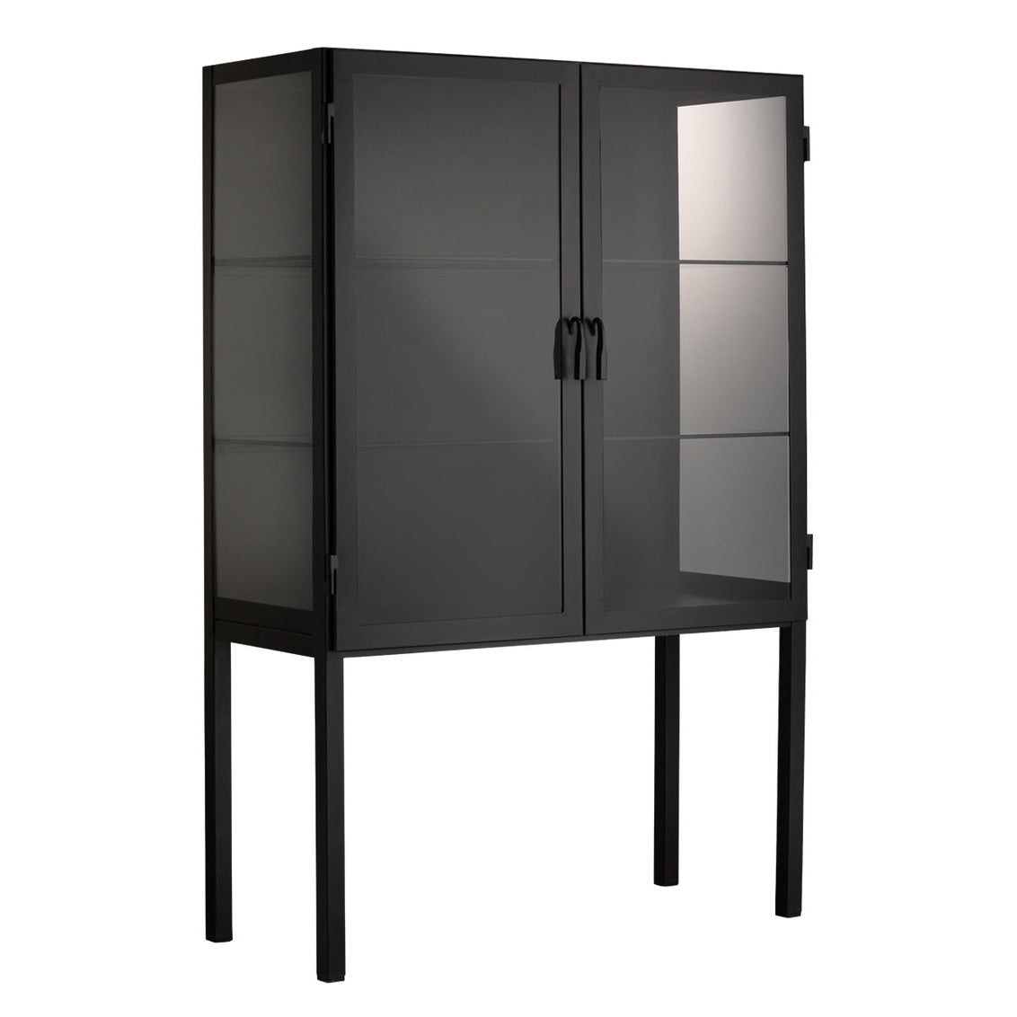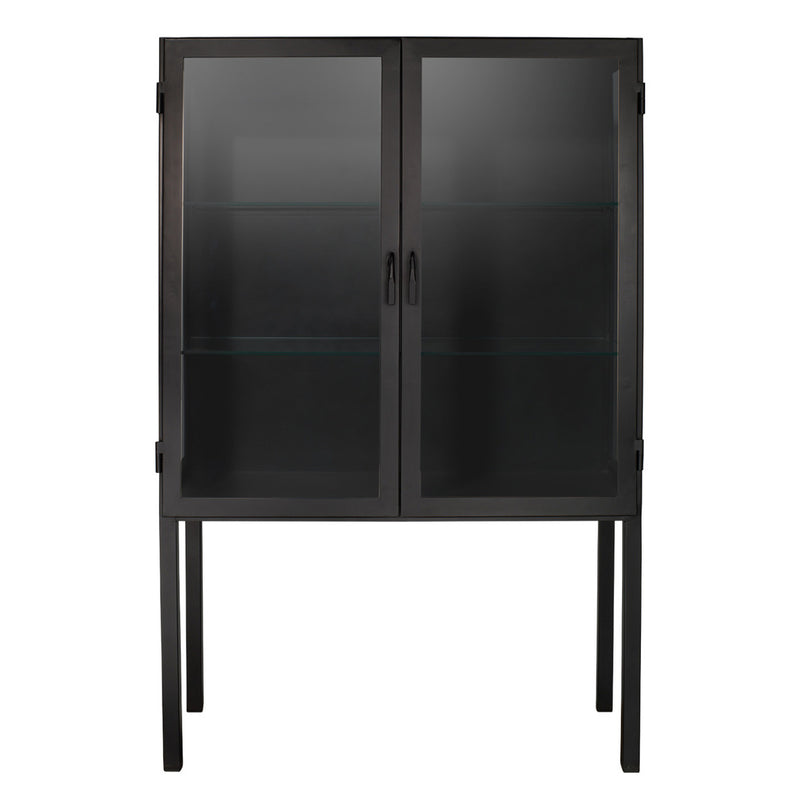 The Jamie Young Chauncey Wide Curio cabinet features glass panes encased in simple black metal to create a wide, minimalistic cabinet perfect for storage or display. Use this piece to showcase your favorite barware or books. This metal cabinet is intended to have a rustic appearance that may include spotting and variances in tone and luster.