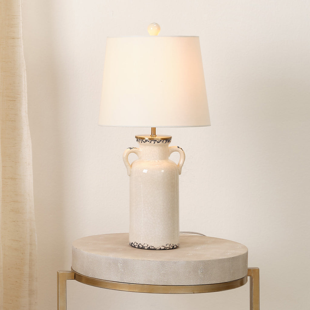 Expert antiquing lends this ceramic lamp the look of a vintage treasure. The base and coordinating ball finial are finished in cream, and the included cone shade is off white linen. Metal accents in antique brass contrast elegantly.