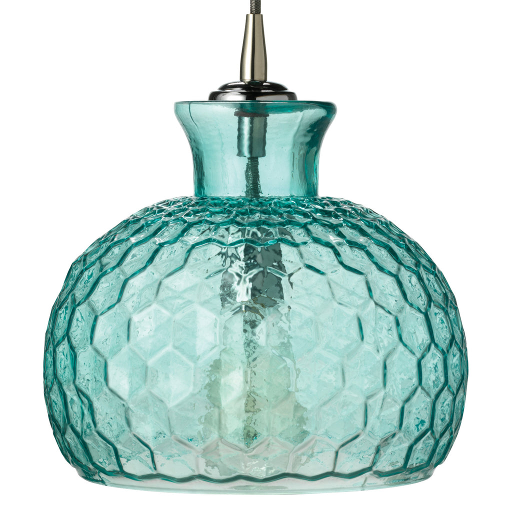 This pendant adds a chic touch of color to an entryway, kitchen, or dining area. The aqua glass shade features a honeycomb pattern that is softened by its gently rounded silhouette. Rich in texture and dimension, it beautifully refracts the light within. Hang in singles or multiples for a striking display.