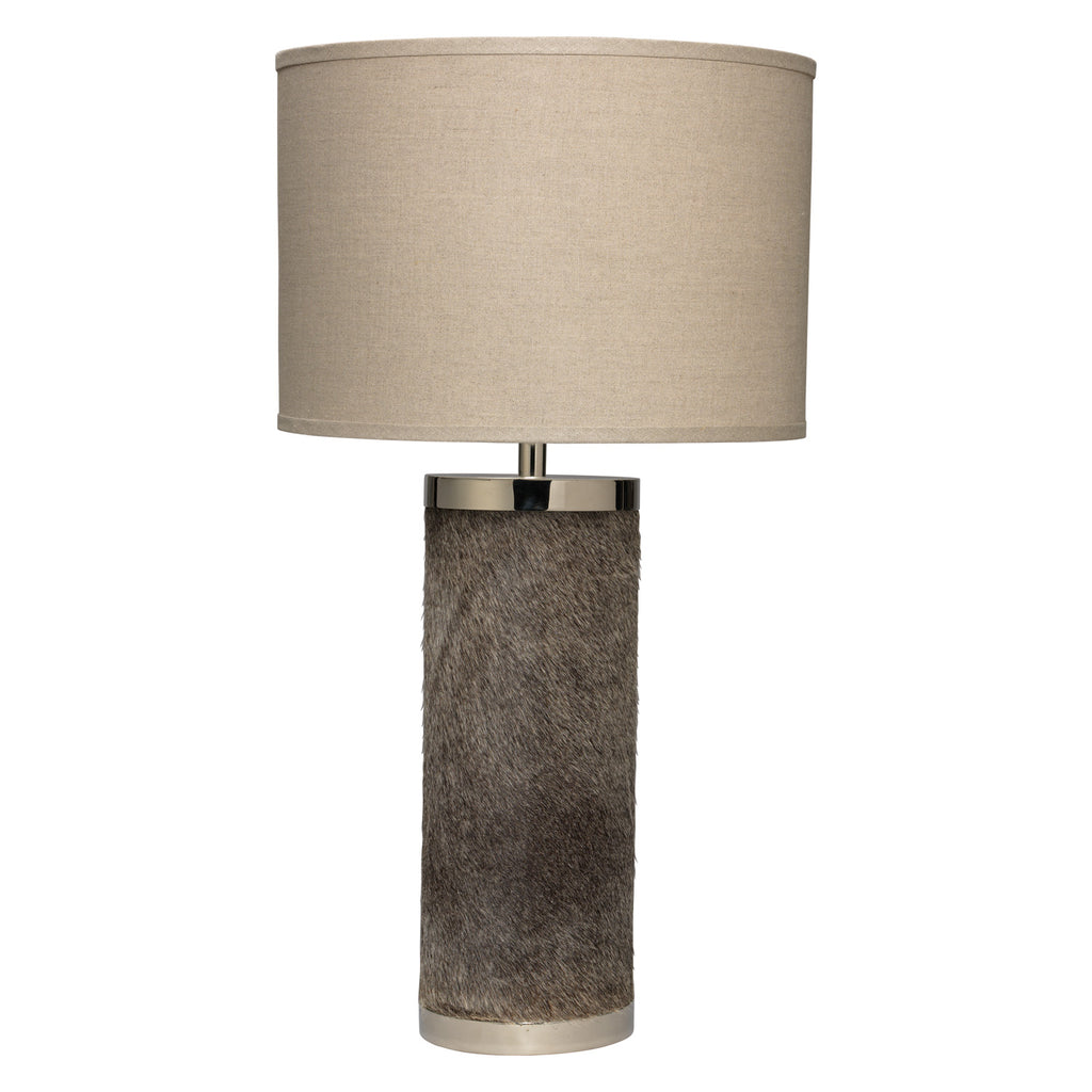Add a striking look to your home with this animal inspired table lamp. A metal and wood base is adorned with faux hide and topped with a natural linen shade.