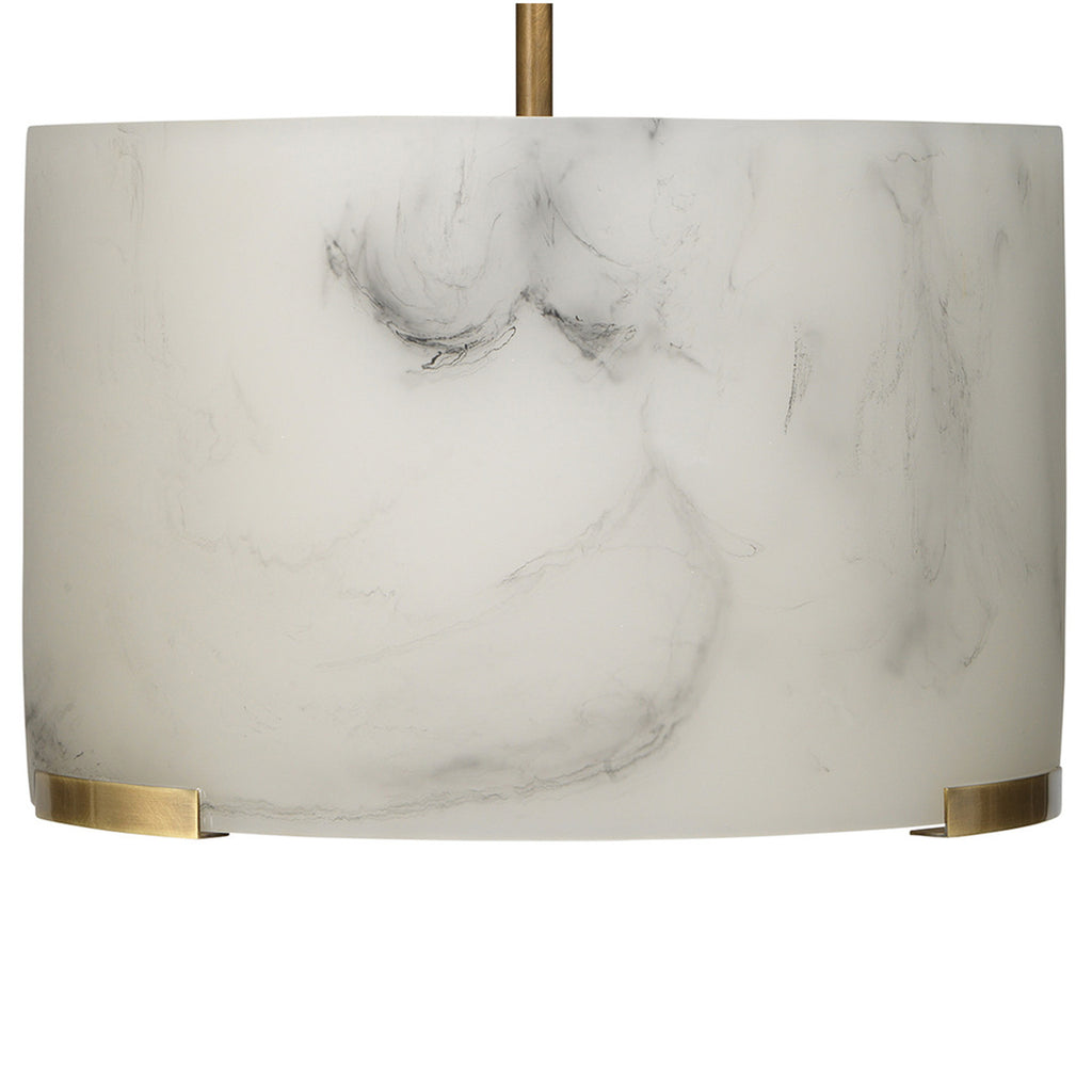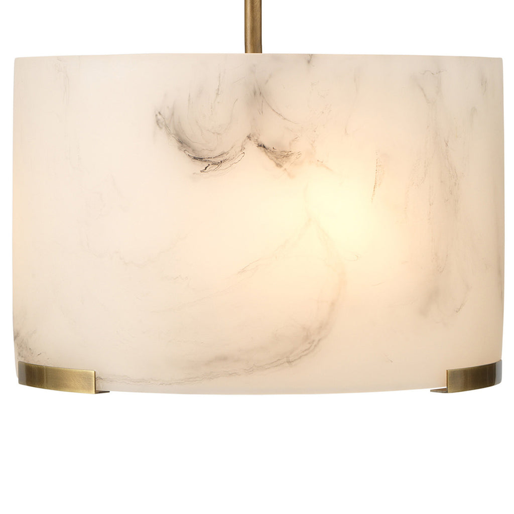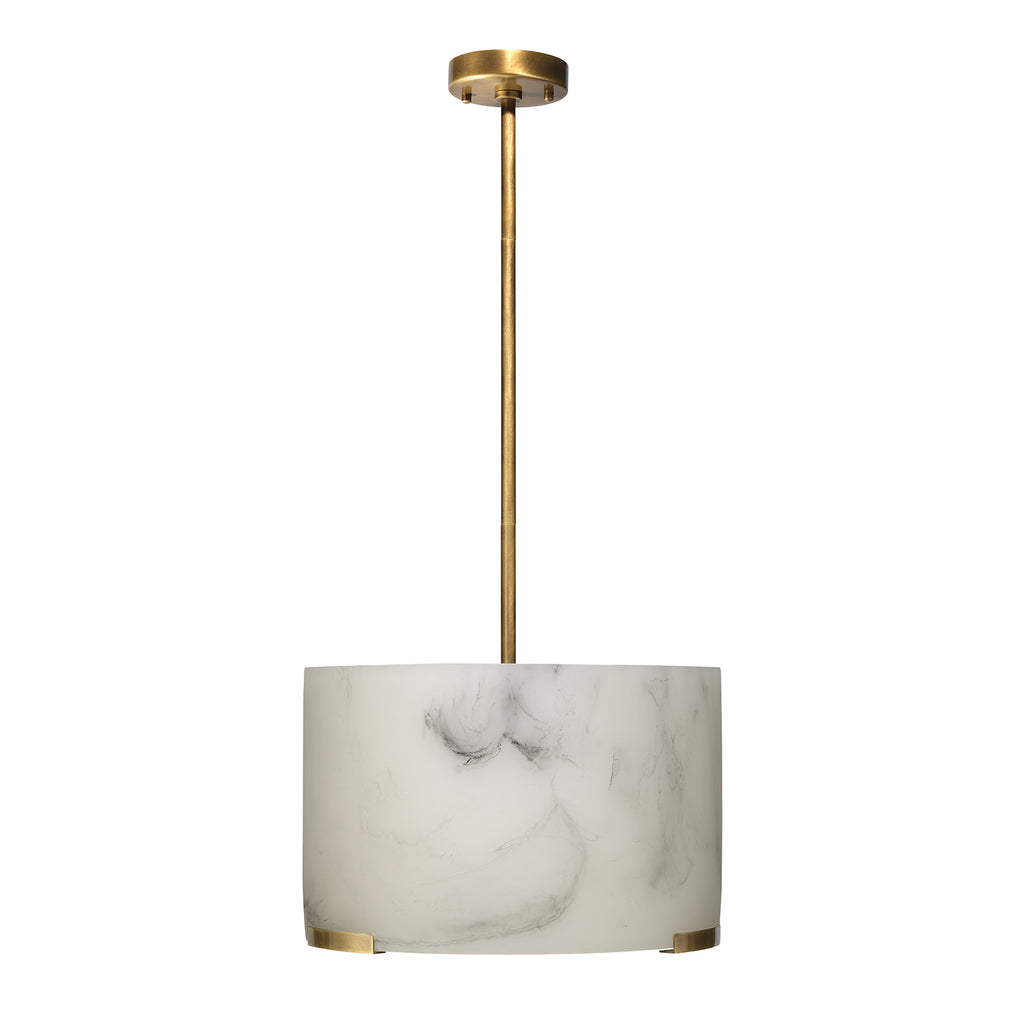 Soften your space with the elegance of this pendant, featuring a faux alabaster drum shade. Crafted meticulously from high-quality resin, each shade replicates the delicate swirl patterns and veining of natural stone (without the weight) for a one-of-a-kind effect in each piece. Enhanced by metal accents and hardware finished in naturally warm antiqued brass, this pendant combines artistry with functionality for an unparalleled aesthetic impact.