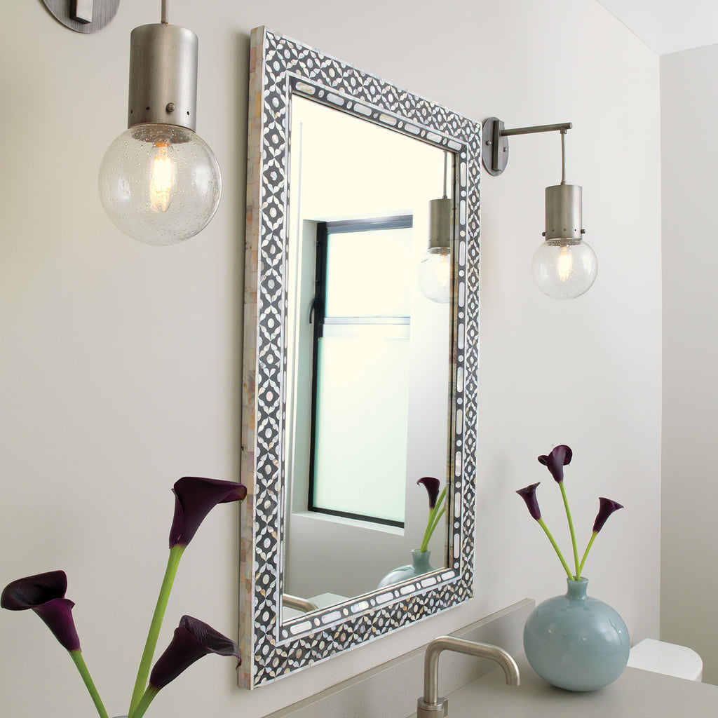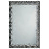 Mother of Pearl inlayed in an exquisite design for an exotic yet graceful Jamie Young Evelyn rectangle wall mirror to any room in a beautiful grey and white pattern.
