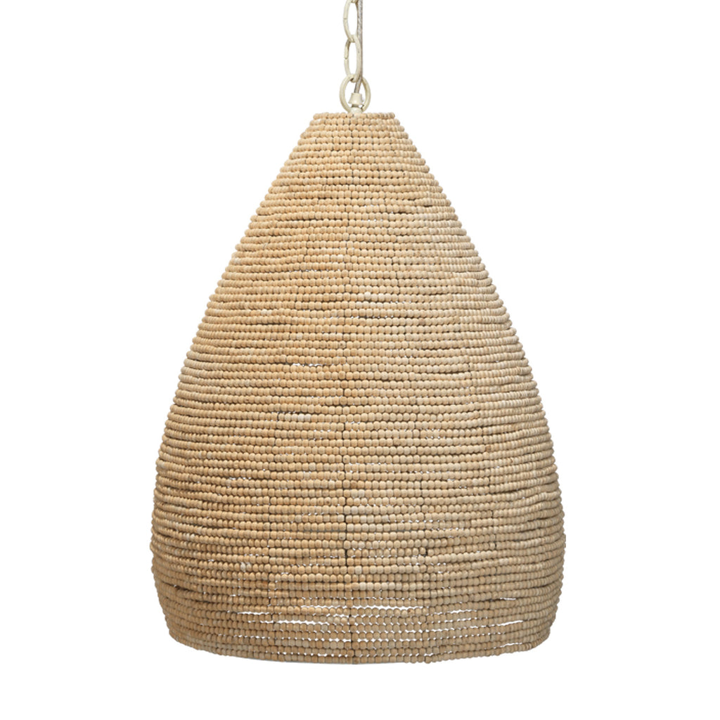 Strings of beads made with mango wood line the body of the oversized Jamie Young Gulf Stream pendant. A white iron chain compliments the natural tone and texture of this piece. A statement piece with repeating patterns and textures like this can help add interest to any coastal palette.
