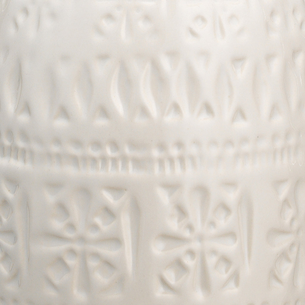 The Halidon table lamp features a delicate band of repeating pattern on the ceramic clay. The simple glaze falls over the imprinted decoration to create stunning highlights and recessions in the finish hue. Each of its available three colors is paired with a white linen lamp shade, allowing this dainty lamp to bring a touch of grace to any room.