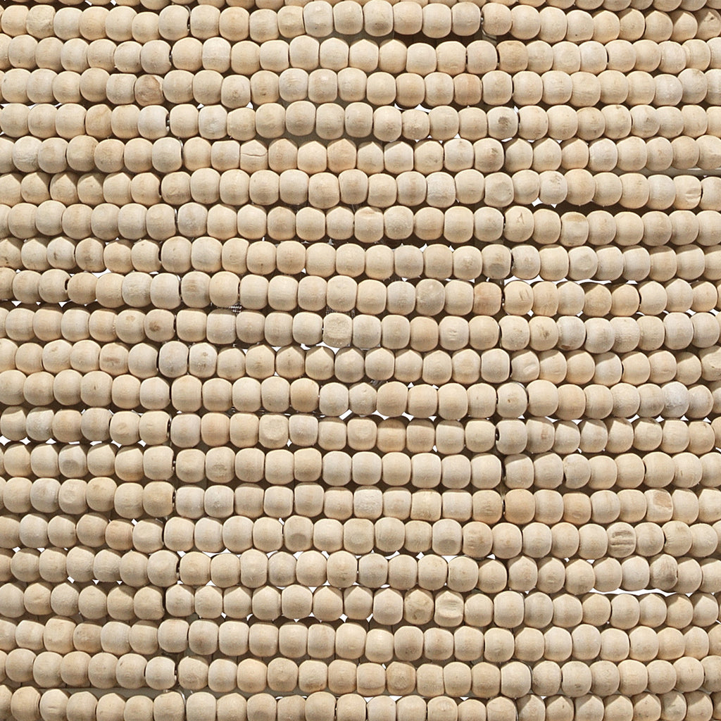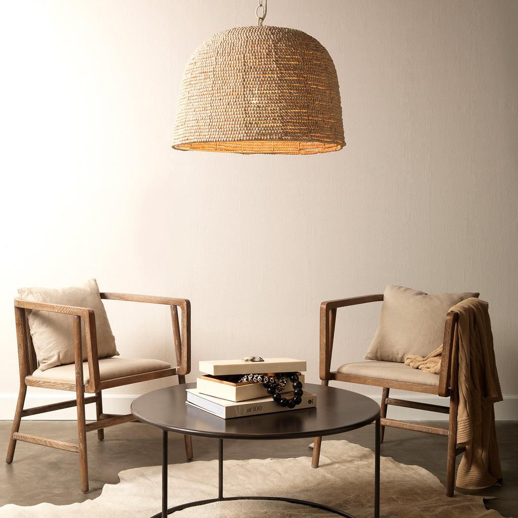 Strings of beads made with mango wood line the body of the oversized Jamie Young High Tide Pendant. A white iron chain compliments the natural tone and texture of this piece. A statement piece with repeating patterns and textures like this can help add interest to any coastal palette.