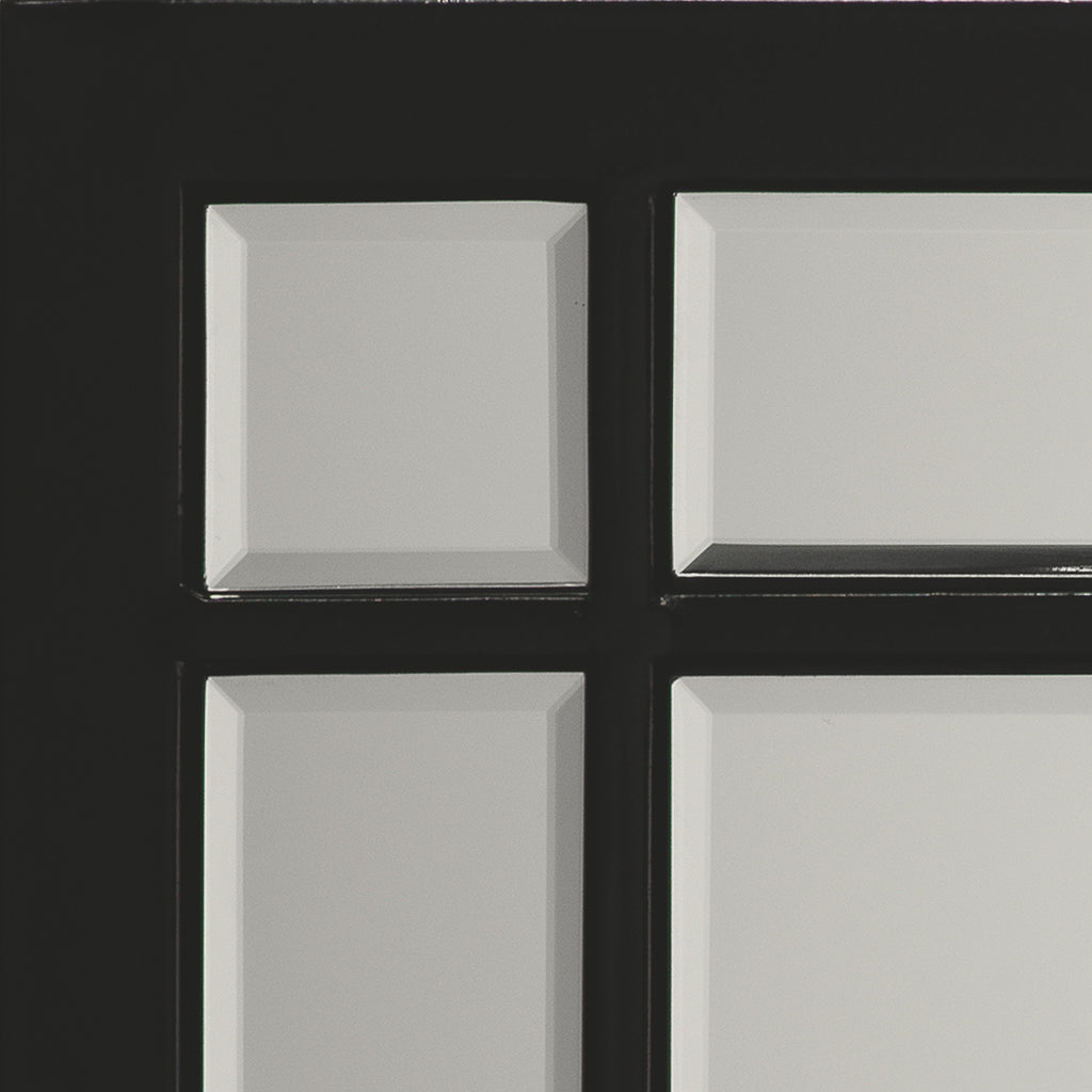 Extremely versatile, this beveled grid mirror is made of matte black steel matching nearly any style of decor.