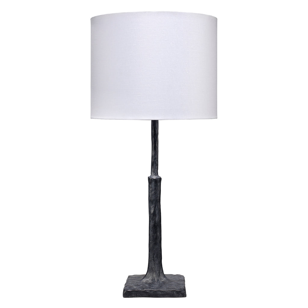 The Humble Desk Lamp is a slender tabletop lamp made from polyresin plaster with a textured charcoal finish. The richly textured base of the lamp lends it a hand-done appeal, and its white linen drum shade and coordinating finial add refinement.