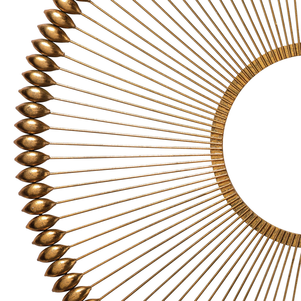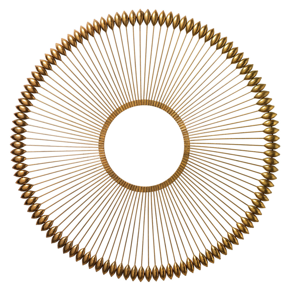 The Jamie Young Illume wall art piece adds great texture to all walls. Its repetitious pattern of bold gold lines ending in soft teardrop shaped gold orbs creates quite a statement. With a nod to midcentury design, this updated wall art piece will stand the test of time.