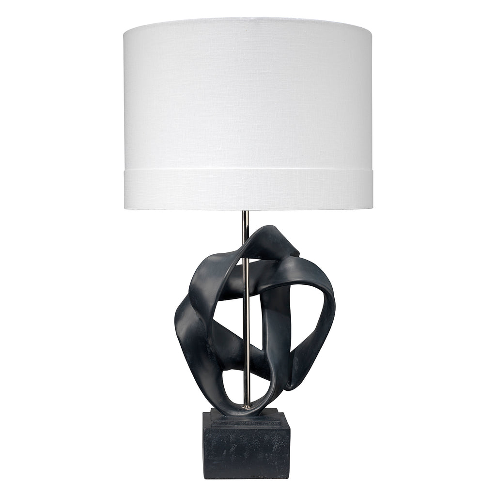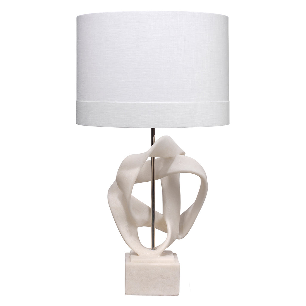 Substantial straps of resin wrap and twist around a center support in the Intertwined Lamps, creating a lighting option full of smooth curves and visual interest. A museum quality resin base provides the foundation, and a slim tube of silver-toned metal supports the white linen drum shade that tops. A beguiling addition whether placed next to a stack of books or incorporated into a console table curation, it is an unexpectedly intriguing accent ideal for any modern décor.