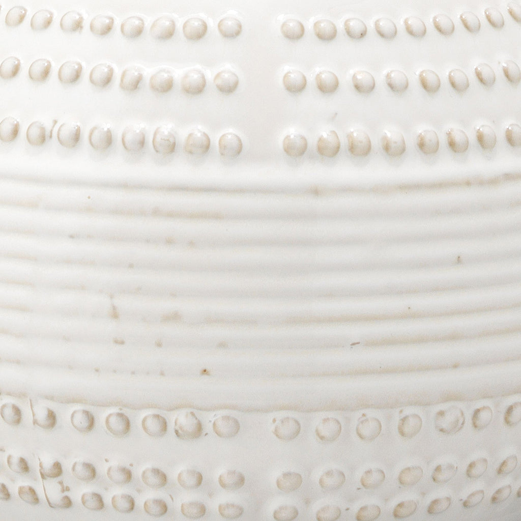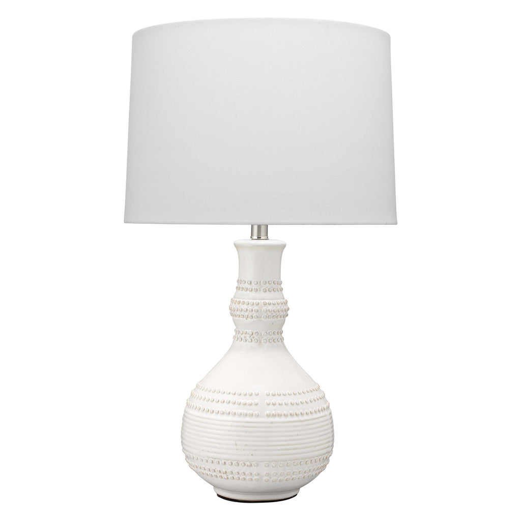 Taking inspiration from global pottery, this unique piece adds visual texture and intrigue to any room. Handcrafted of ceramic, this lamp features a unique pattern of raised circles and subtle ridges. Topped with a crisp linen shade for tonal beauty, the fixture provides the perfect match for a relaxed living area or bedroom.